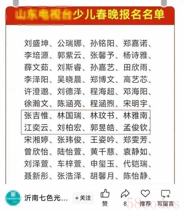 记者梳理发现,2021年,某艺教机构公布了其声乐比赛的获奖名单,其中,“最忙五人组”斩获一、二、三等奖。其他获奖者名单,也同样出自网络人名库。2023年,“最忙五人组”的名字又出现在了山东某少儿培训机构公示的少儿春晚报名名单中。