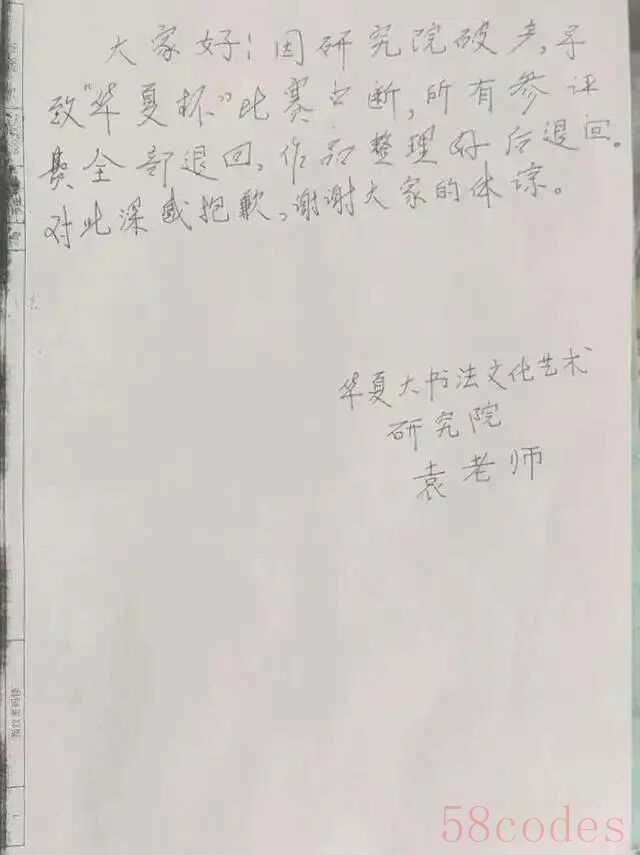 12月4日下午,记者联系上主办方华夏大书法文化艺术研究院,对获奖名单造假的原因,工作人员一开始声称不太清楚,后又给记者发送了一张手写道歉信,落款为该研究院负责人袁老师。