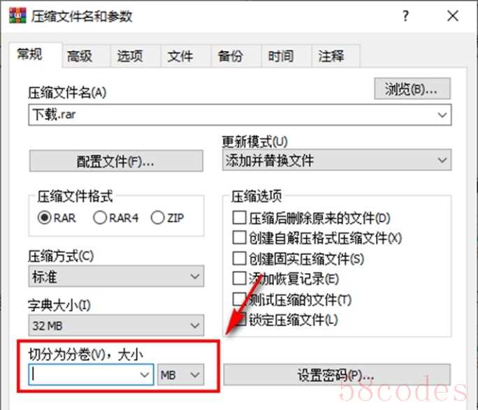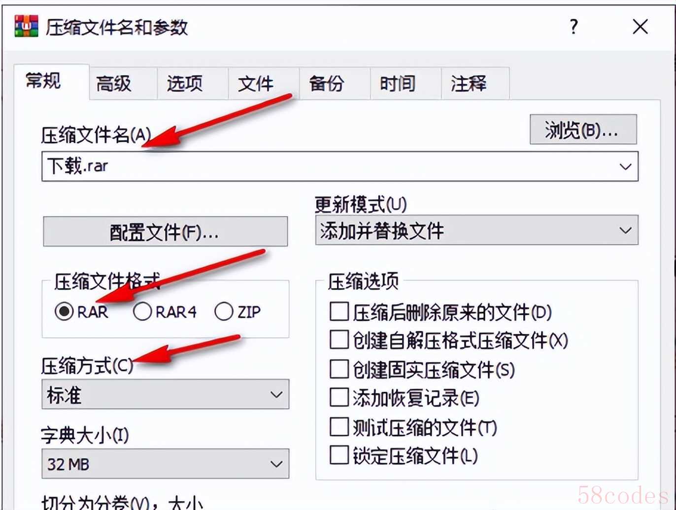 2、进入winrar的压缩文件名和参数设置页面之后,我们在该页面中首先输入压缩的文件名,然后设置好压缩文件格式以及压缩方式。