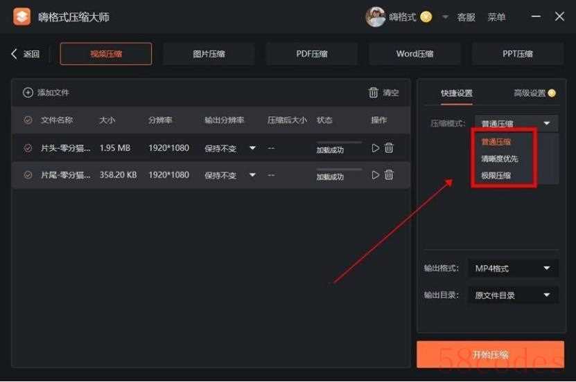 2、 添加需要压缩的一个或者多个视频,右侧选择需要压缩的模式。