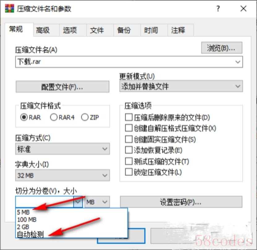 4、打开分卷选项之后,我们在下拉列表中根据文件的大小来选择分卷大小,也可以直接点击“自动检测”选项,设置完成之后直接点击“确定”选项开始分卷压缩即可。