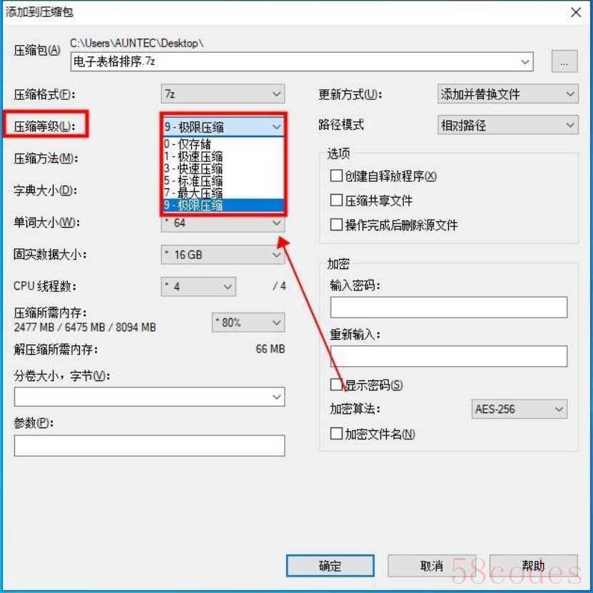 3、选择【压缩等级】,极限压缩的文件是最小的,但是压缩后的质量也是最低。
