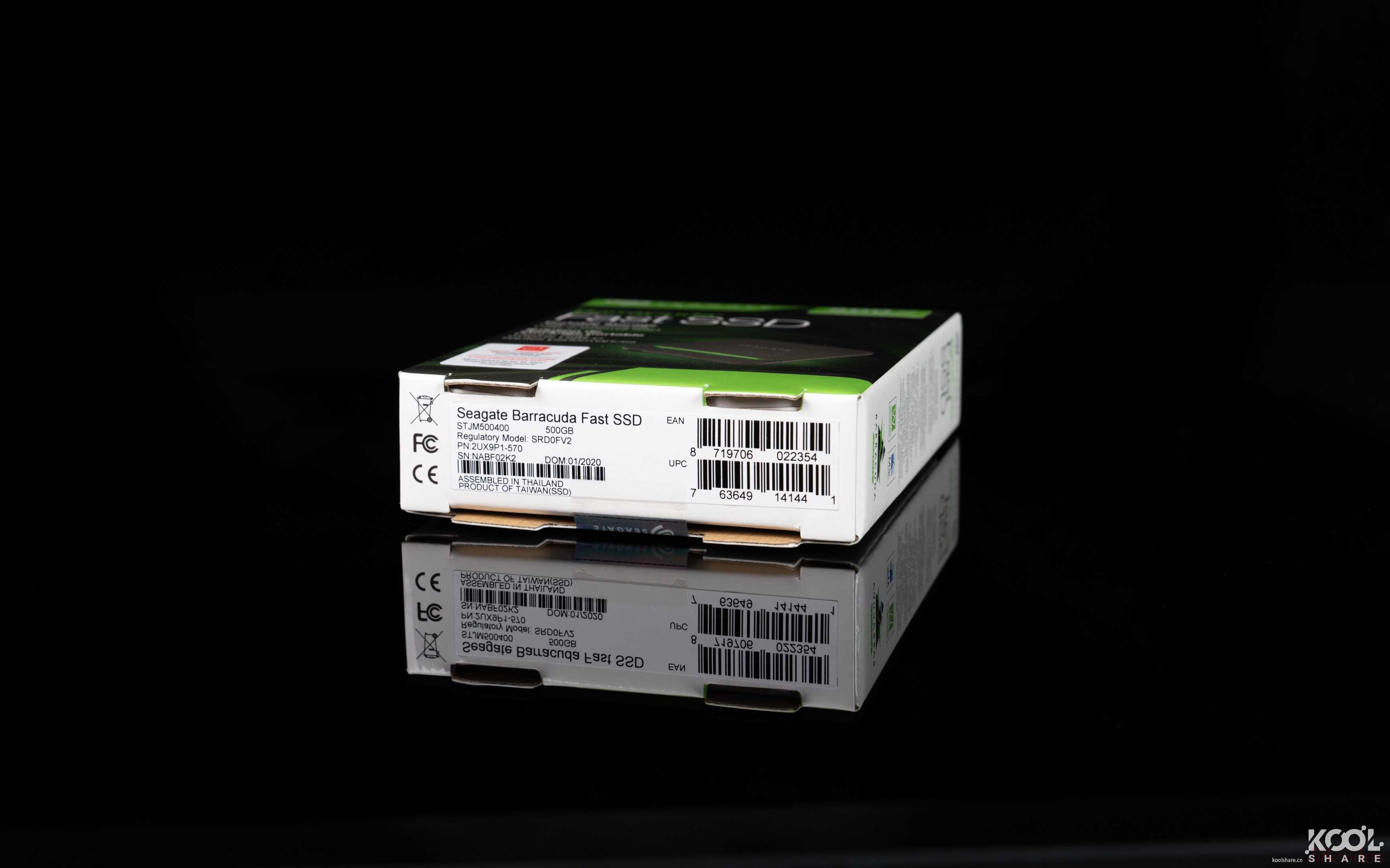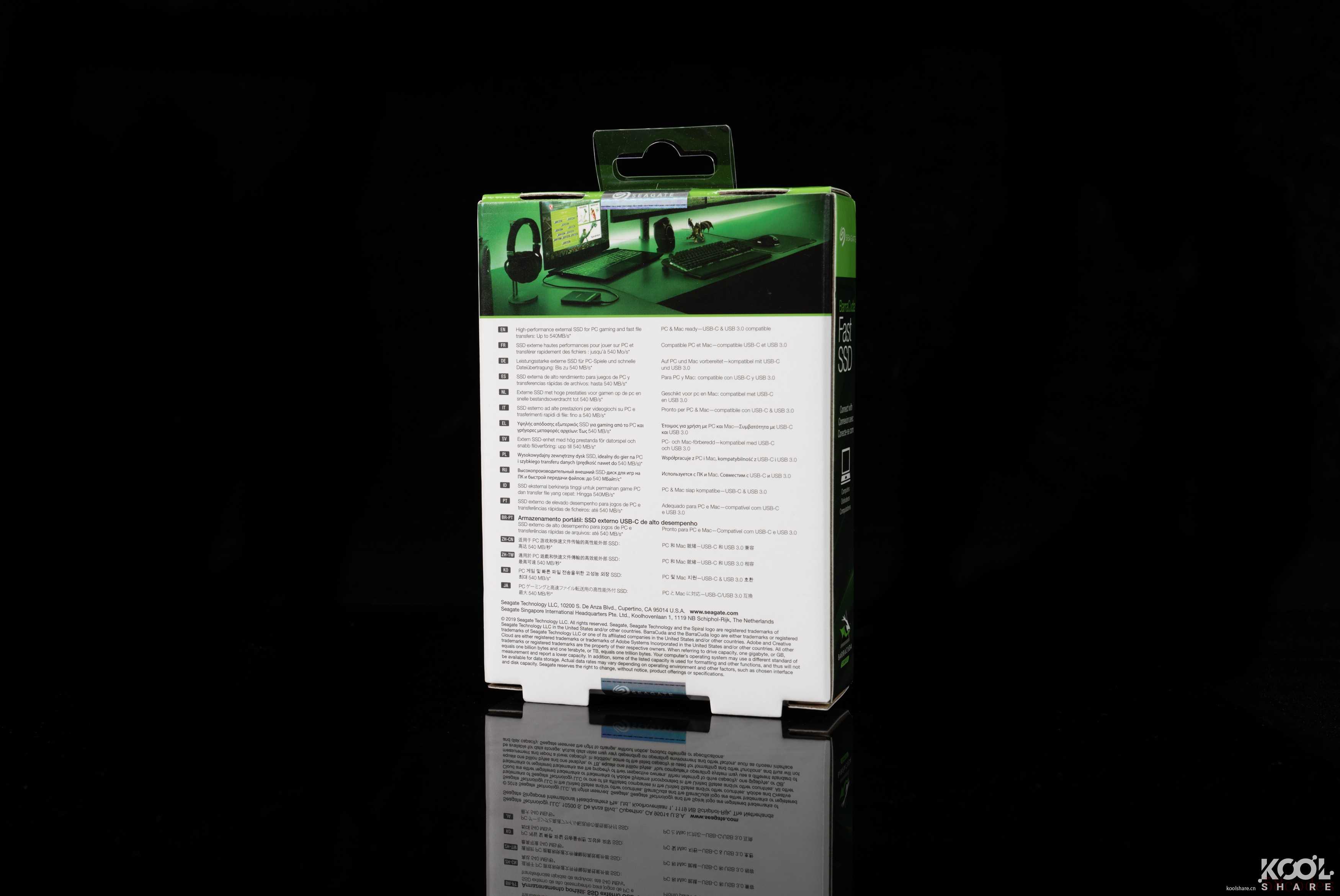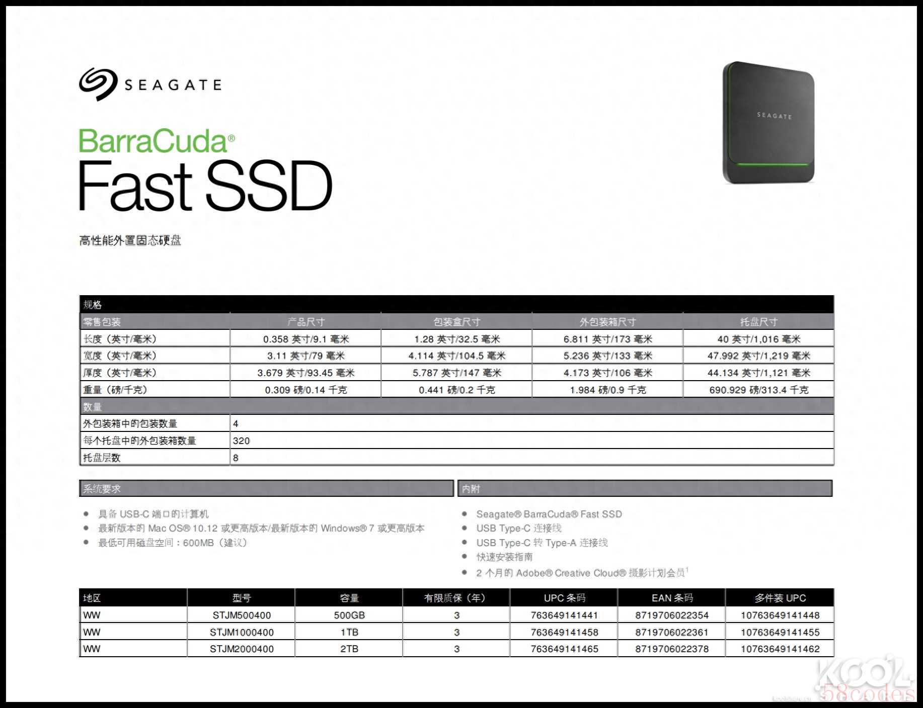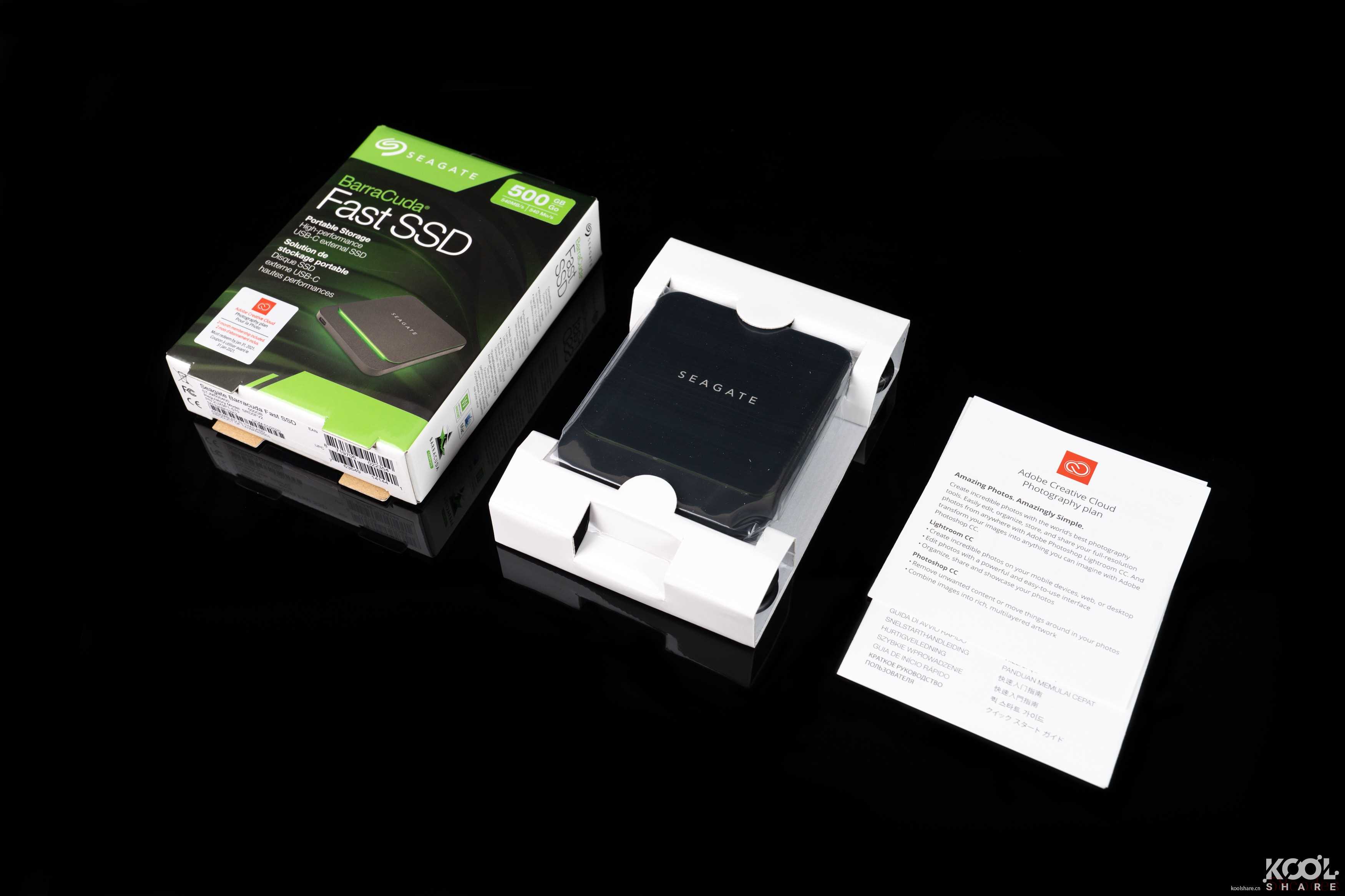 ▲希捷酷鱼Fast SSD移动硬盘包装盒采用酷鱼系列一贯的黑绿配色,左下角可以知晓希捷酷鱼Fast SSD依旧赠送2个月的 Adobe Creative Cloud摄影计划会员