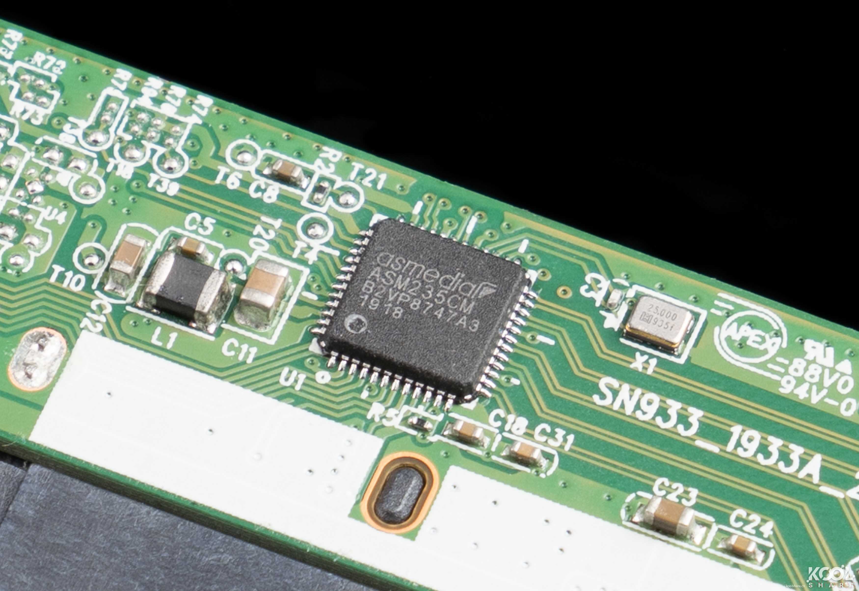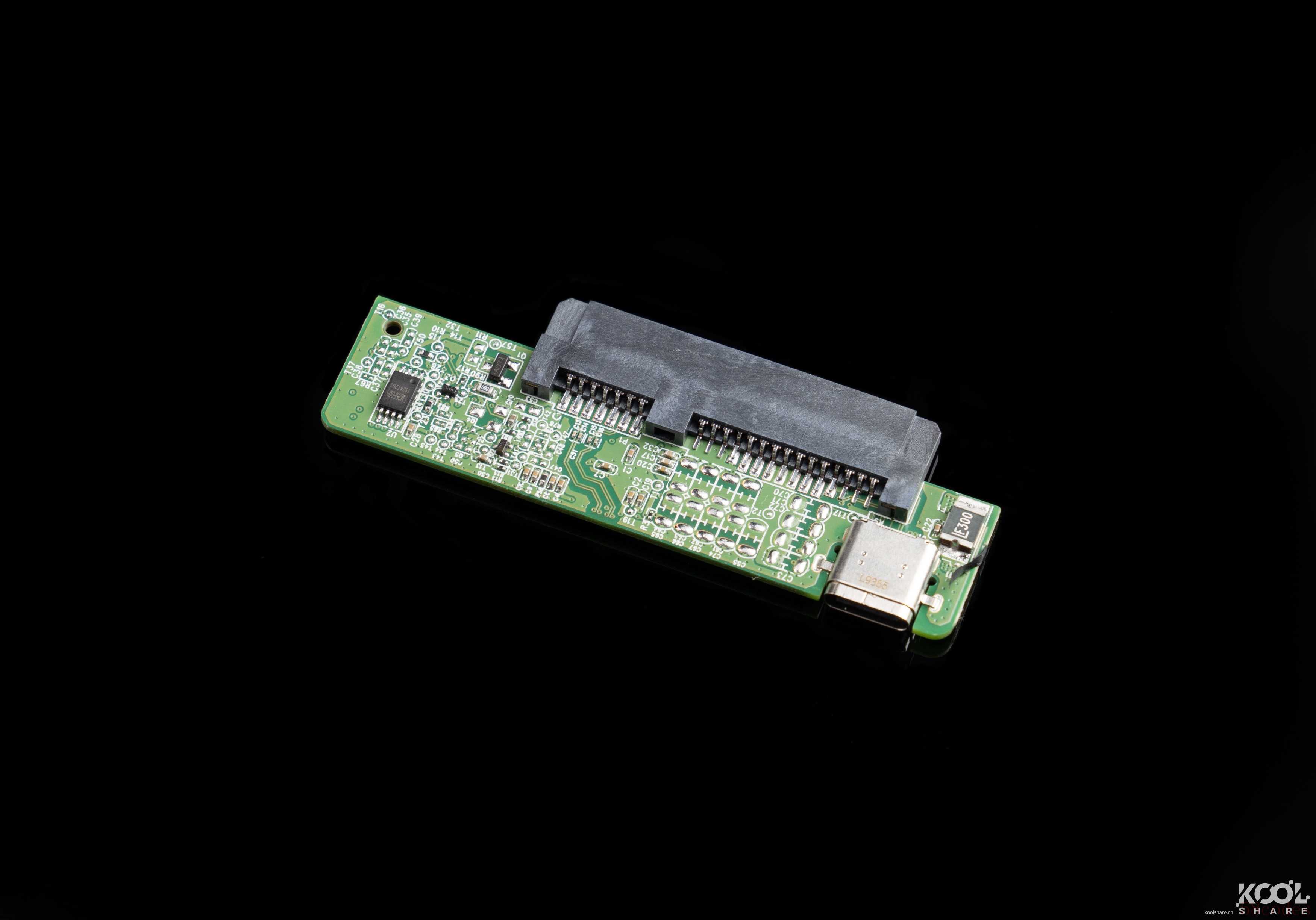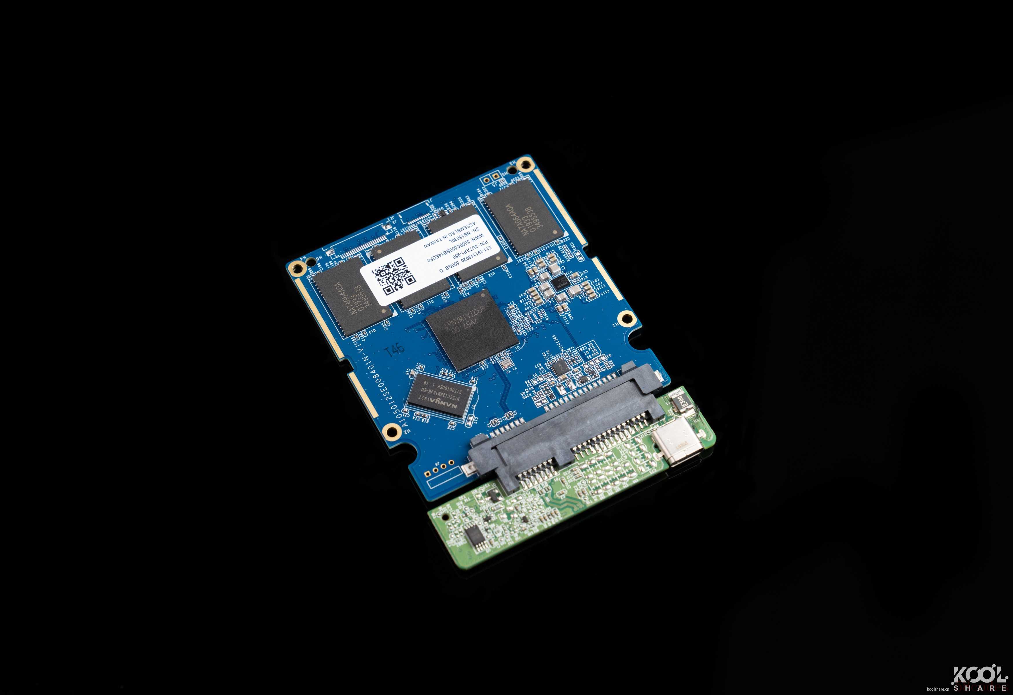 ▲PCB部分分为两块,一块是SSD所在的PCB主板(蓝色),另一块是USB-C to SATA转接板(绿色)