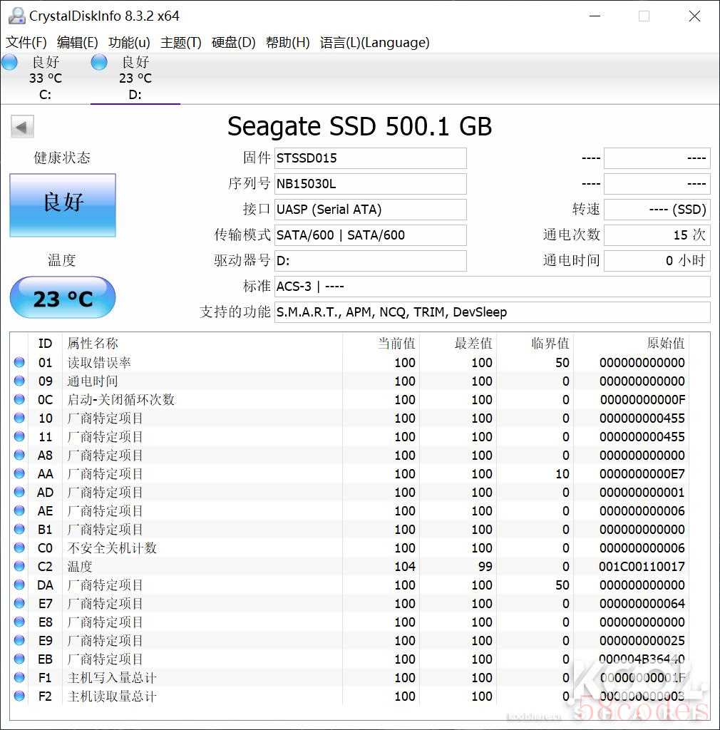 ▲CrystalDiskInfo信息一览,可能是因为主控太新的原因,Crystal Disk Info目前还无法正确识别写入量等信息