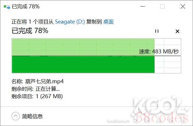 ▲使用Windows PC从希捷酷鱼Fast SSD 500G移动硬盘中取回大文件时,读取速度在483MB/s左右