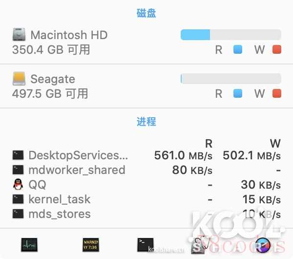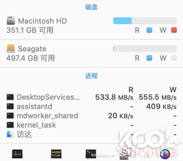 ▲使用MacBook Pro向希捷酷鱼Fast SSD 500G移动硬盘中拷贝大文件时,上传速度在502MB/s左右