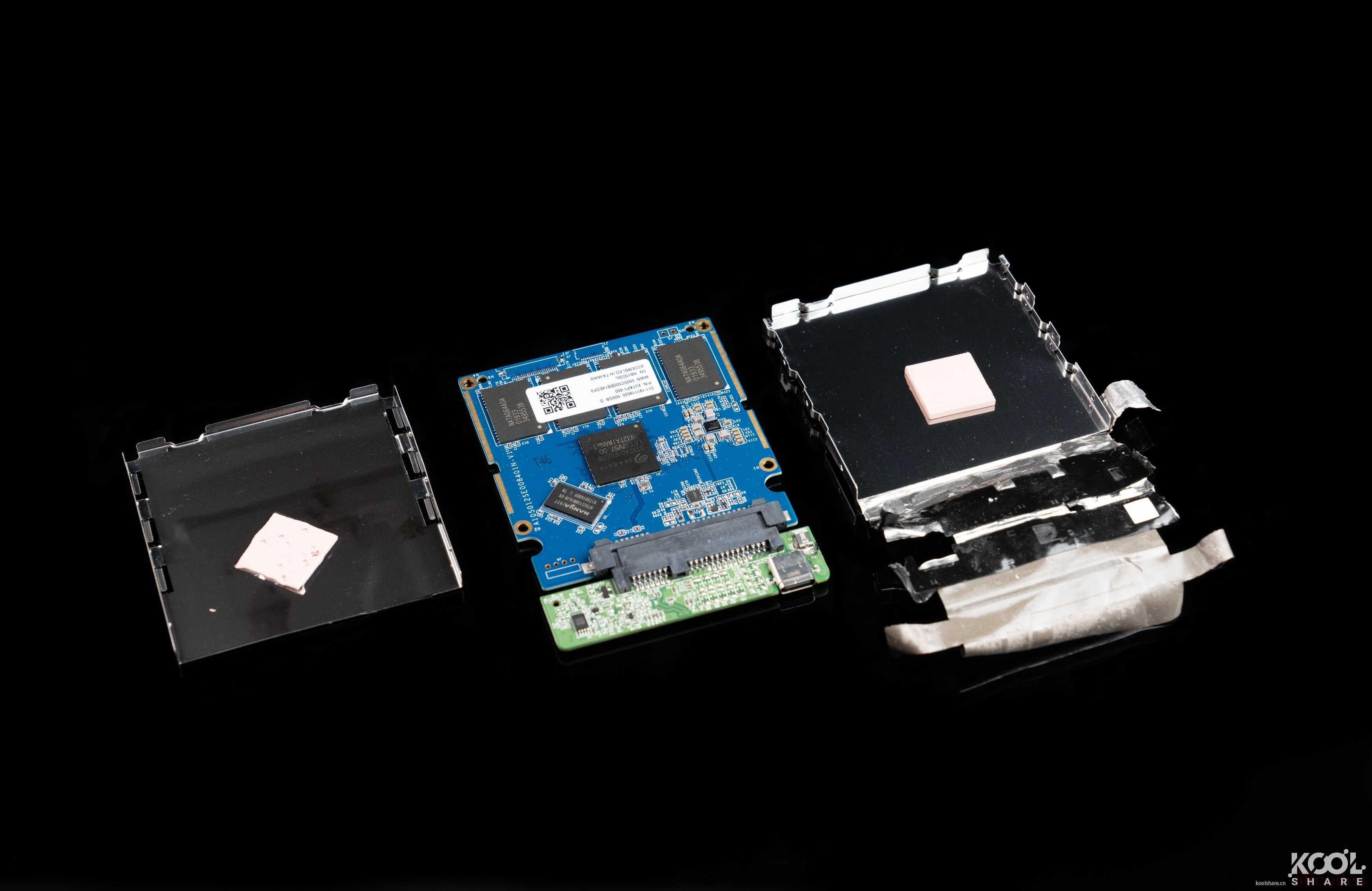 ▲撬开背壳,就能看到内部状况了。SSD主体被铝盖和铝箔密封,能起到不错的屏蔽效果