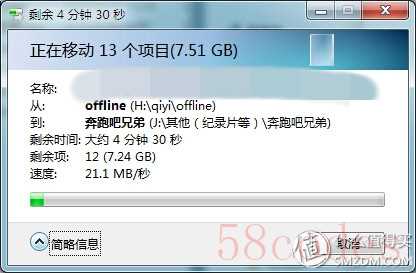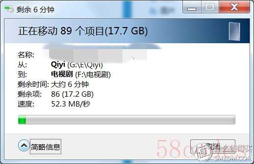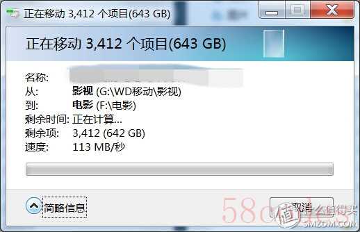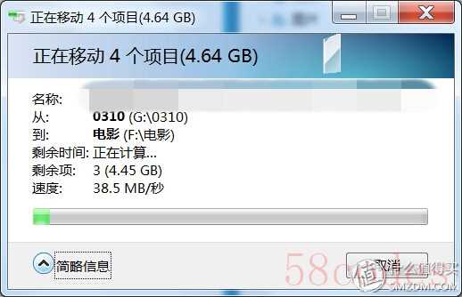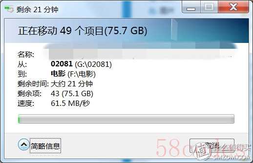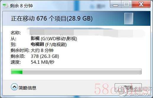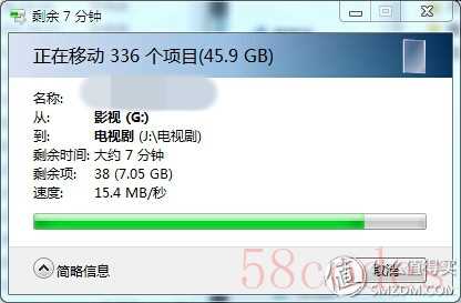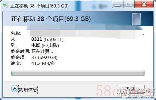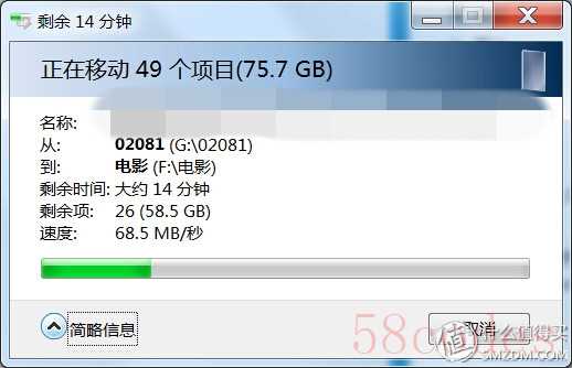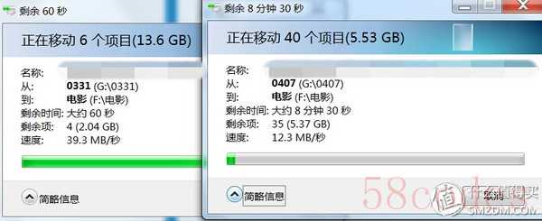 接下来是西数500g移动硬盘往希捷硬盘中剪切文件,同时插在两个不同的usb3.0端口,速度有很大的损失。