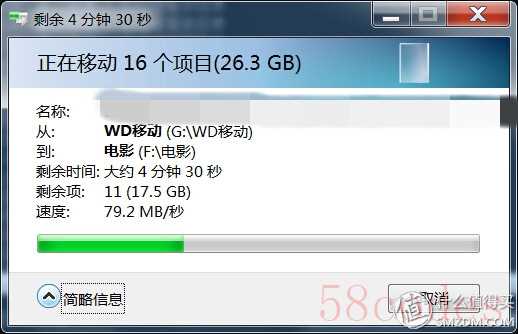 下面这张是将电脑上的大文件拷入到硬盘中,接口为USB3.0。可以看到速度还是蛮快的。