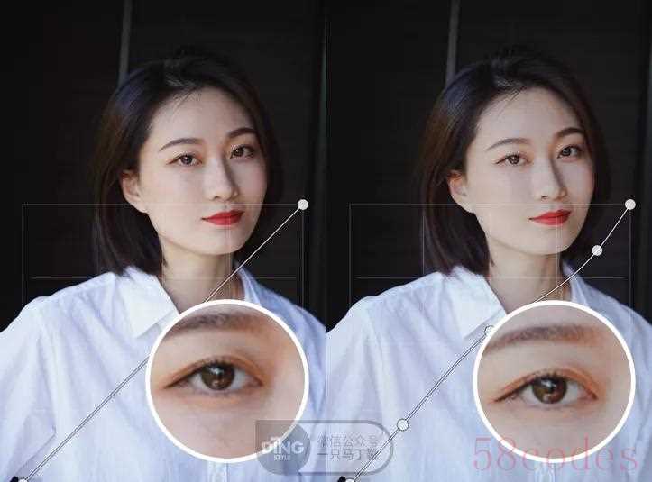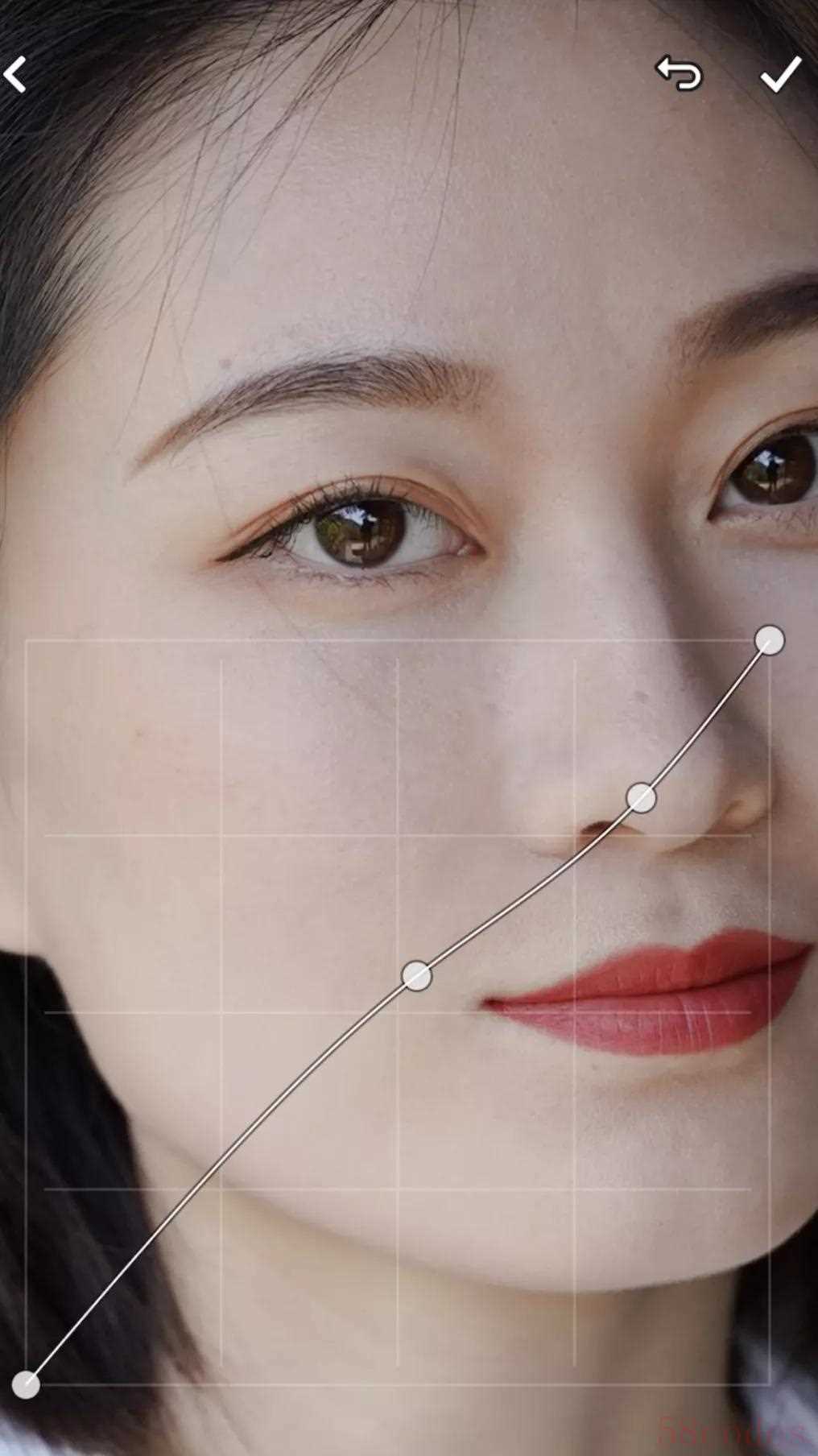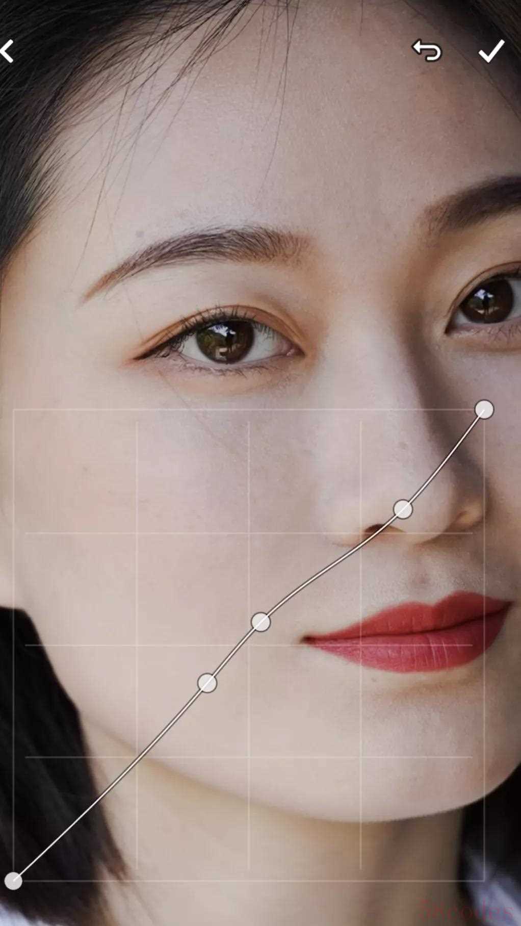 最后一步,刚刚的操作影响了脸的立体度,所以我们调整一下暗调部分,来弥补脸的立体度。控制点选得靠下,头发和眼珠的变化是最明显的,但我最想调的是鼻子。