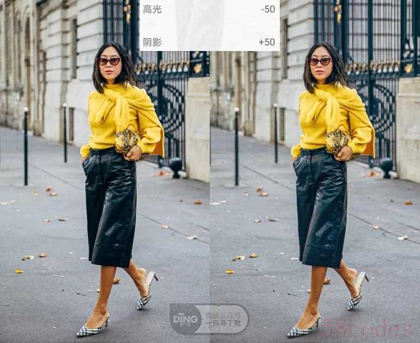 如果觉得上面的颜色对比太鲜明了,不够耐看。可以降低高光,让黄毛衣不那么刺眼;同时提高阴影,让黑裙子的细节能被看得更清楚。