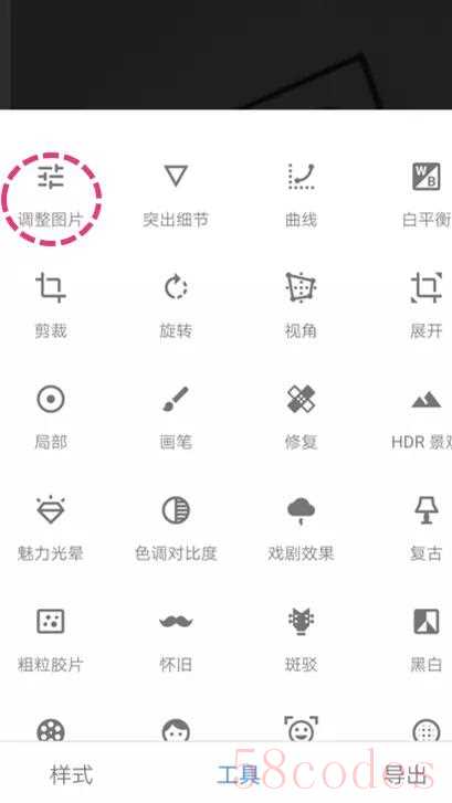 这次示范用到的是 Snapseed ,打开一张图片,选择“工具”,然后选择“调整图片”,就出来这个界面了。