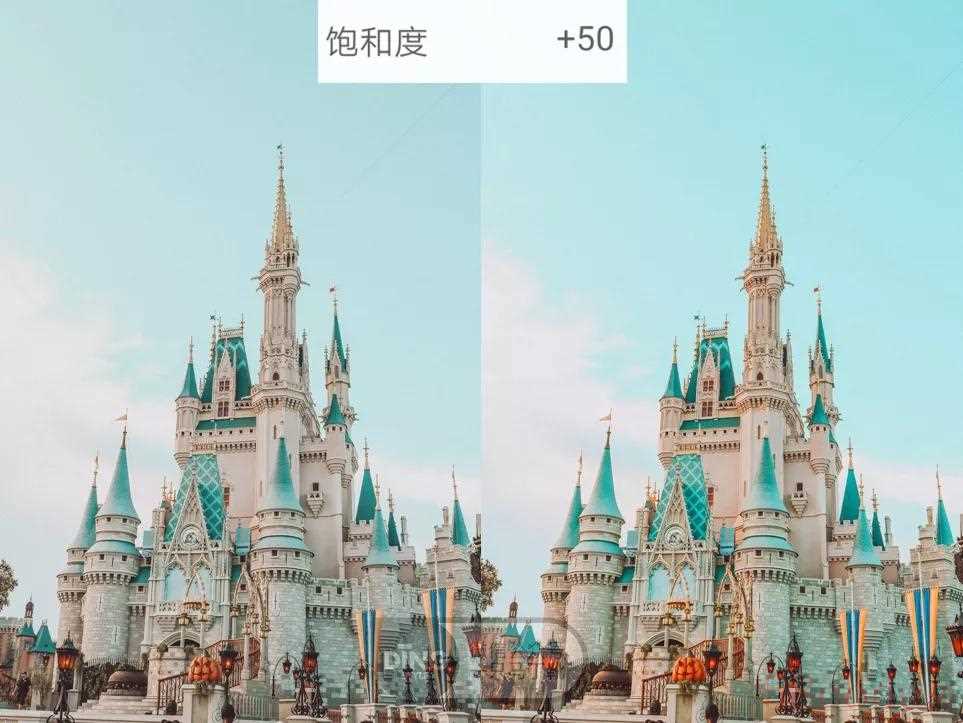 比如嫌弃左边这张城堡图太灰暗了,不够明亮,可以提高饱和度,让整个画面的色彩更加饱满浓郁,看起来更活泼。