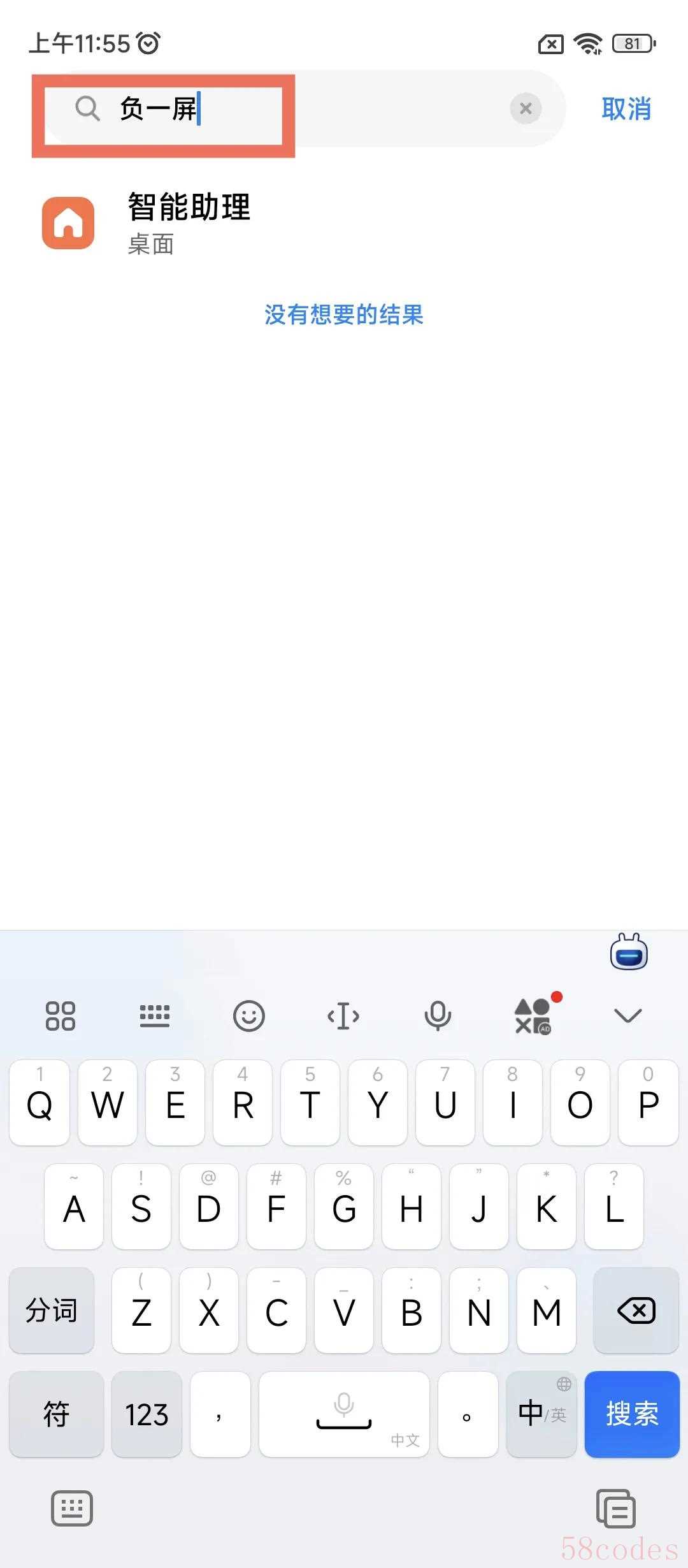 2.打开“设置”后,点击搜索框并输入“负一屏”,选择并点击“智能助理”,见下图二所示: