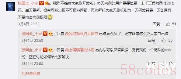 3月5日消息,近日有部分小米10用户反映称,手机刷入开发版内测固件后“变砖”,对此小米系统软件部总监张国全等工作人员也做出了回应。