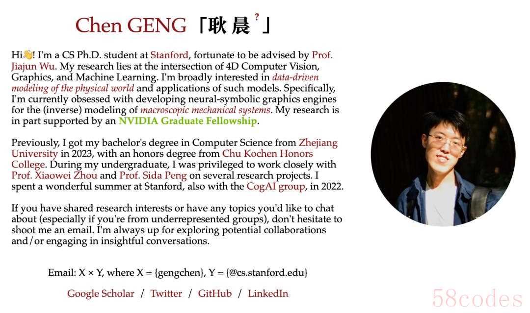 Chen Geng是斯坦福大学的博士生,导师是Jiajun Wu。他的研究兴趣位于计算机图形学与4D视觉的交叉点。他致力于利用可扩展的数据驱动算法和物理启发原理,对四维物理世界进行建模。他的工作推进了面向机器人与科学应用的物理基础三维与四维世界模型(World Models),特别是在动态场景的生成与理解方面。