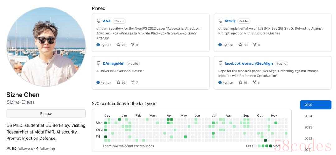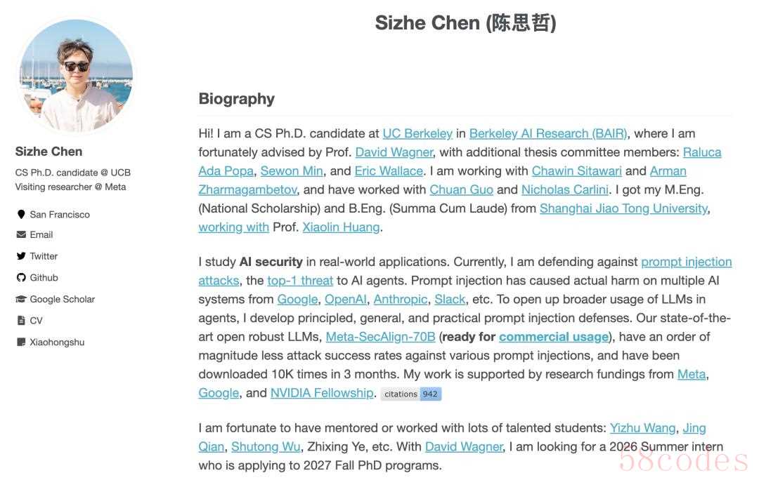 Sizhe Chen致力于人工智能安全领域的研究,重点关注现实场景中的模型防御机制。他目前的研究聚焦于大语言模型(LLM)和智能体(Agents)的安全性,特别是如何通过通用且实用的防御手段(如结构化查询防御)来保护智能体免受提示注入等攻击,同时确保智能体在执行任务时的功能完整性。