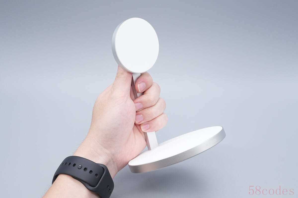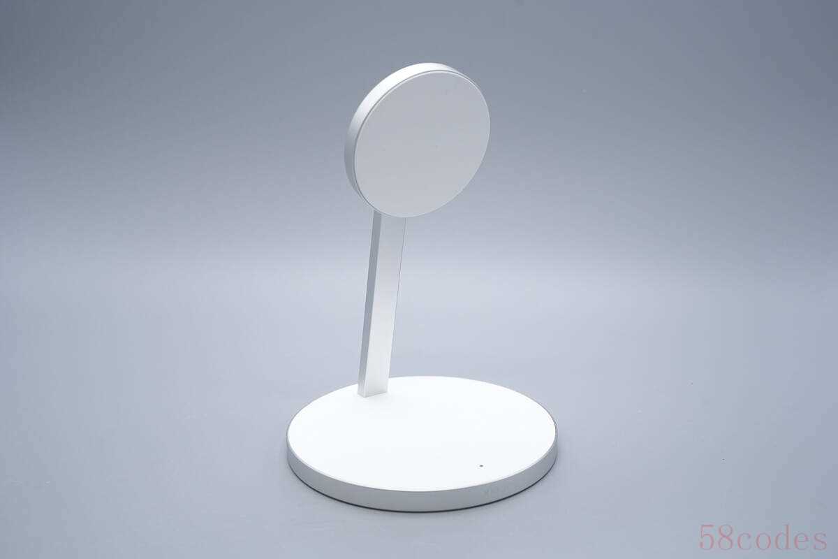 小米30W二合一磁吸无线充由底座、支撑杆以及磁吸无线充电板三部分组成,机身为铝合金+硅胶材质,银白色调,一体化极简设计,简约优雅。