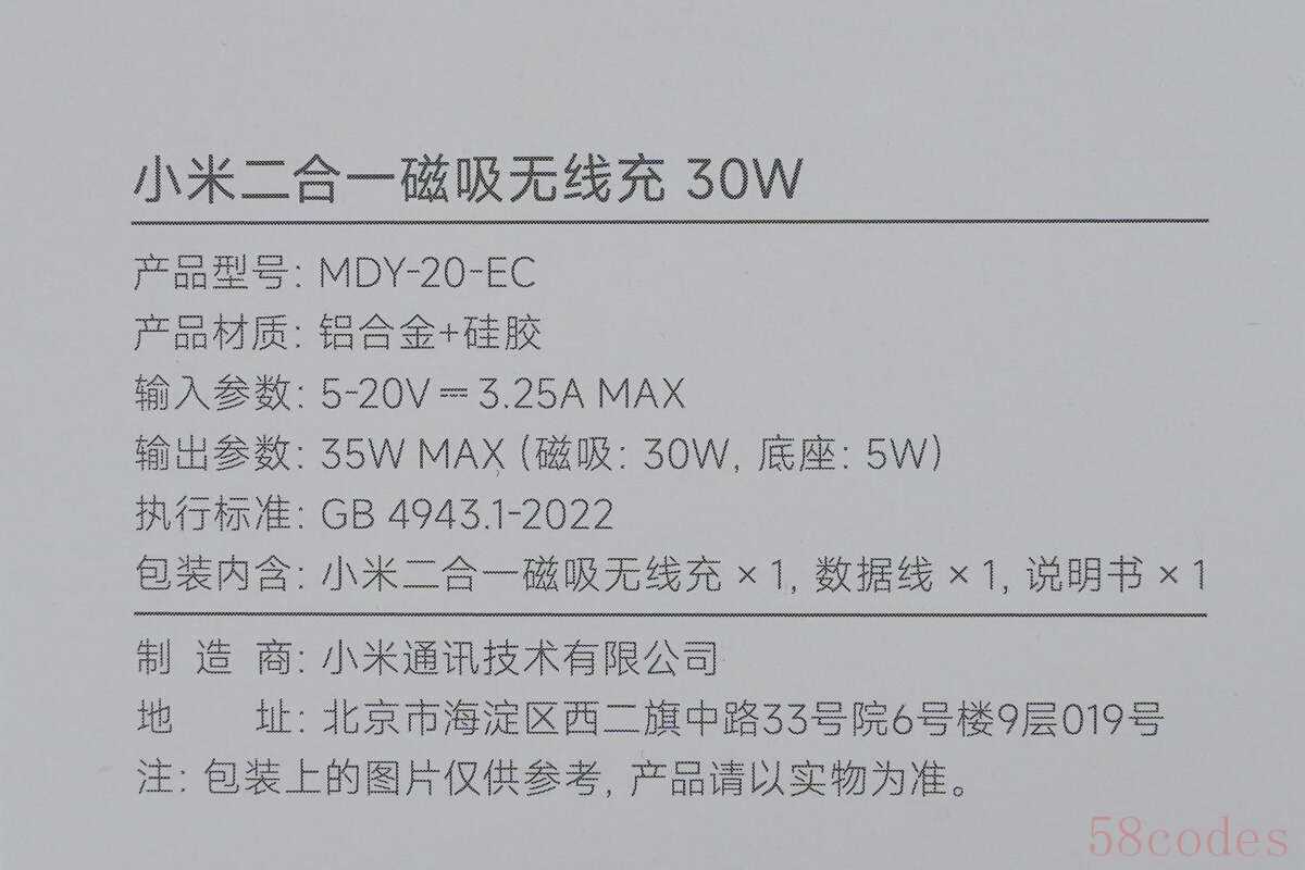 包装内含小米30W二合一磁吸无线充、数据线以及快速入门指南。