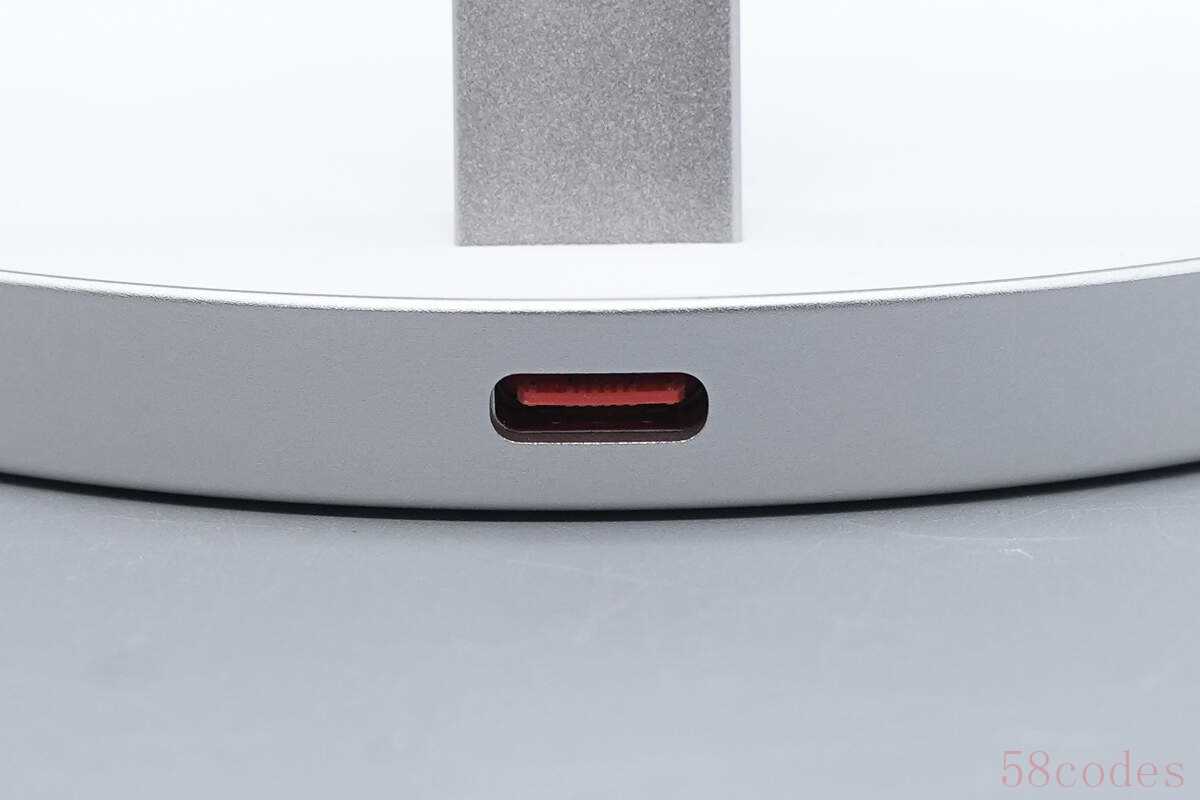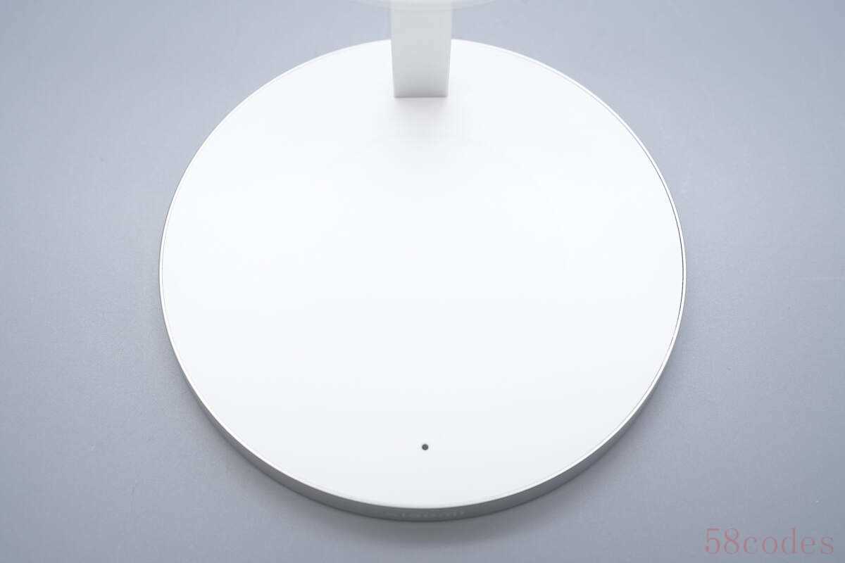 无线充底座圆盘造型设计,顶部采用硅胶材质盖板,并设计有耳机无线充电区域以及无线充电指示灯。