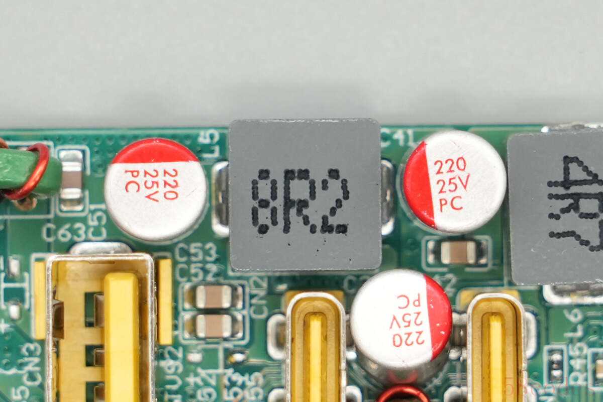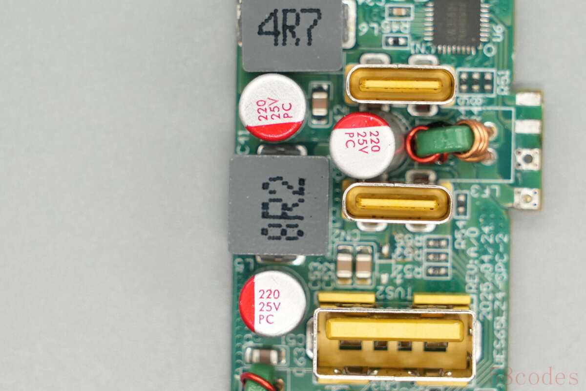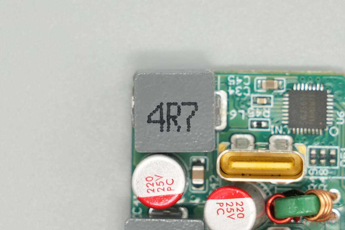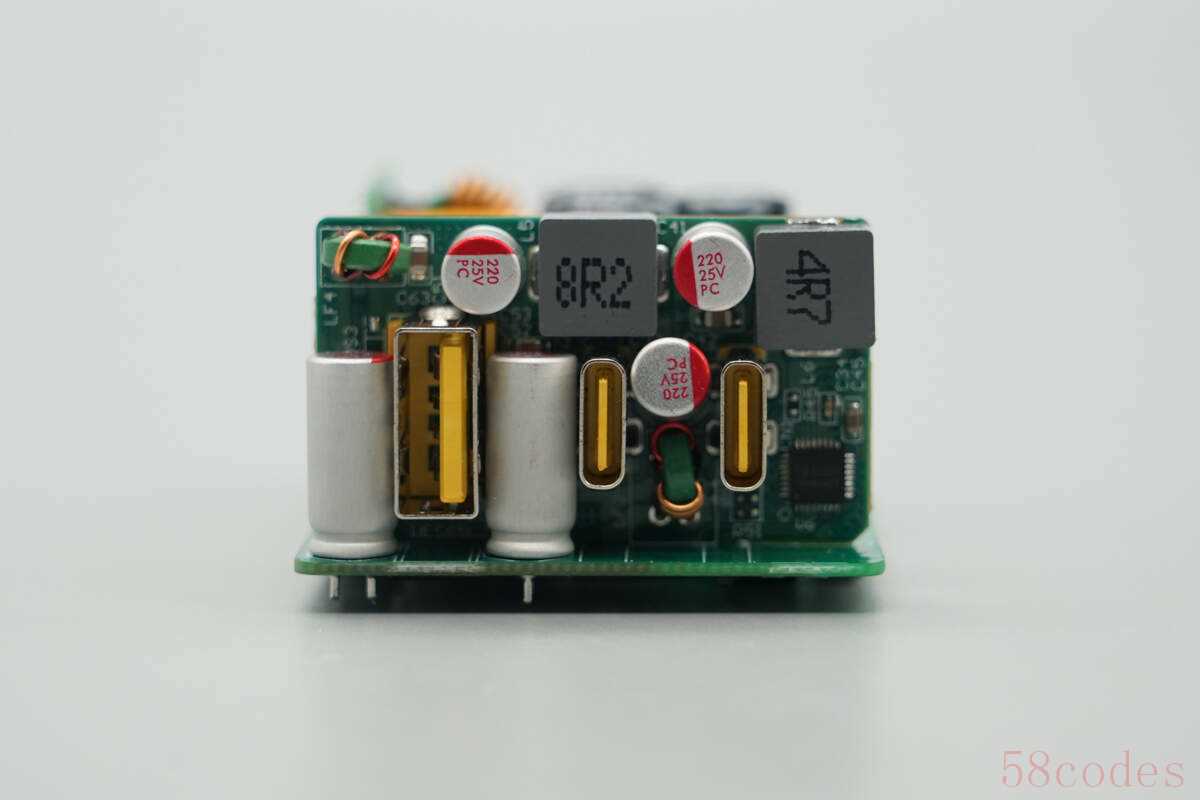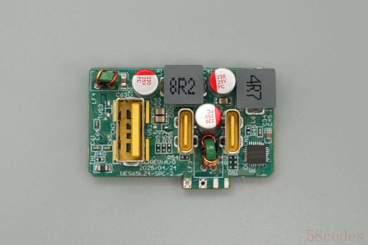 将小板拆下,正面设有USB-C1口的降压协议芯片以及两路二次降压电路对应的降压电感、滤波固态电容、滤波电感。