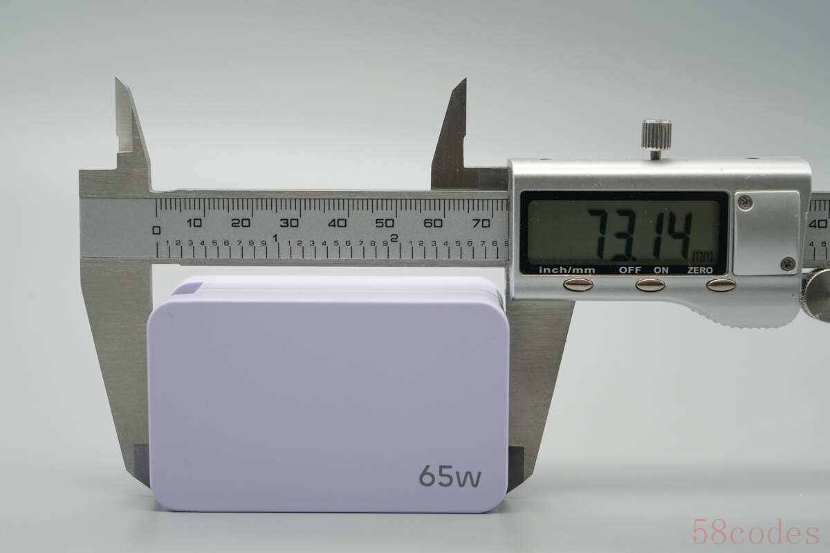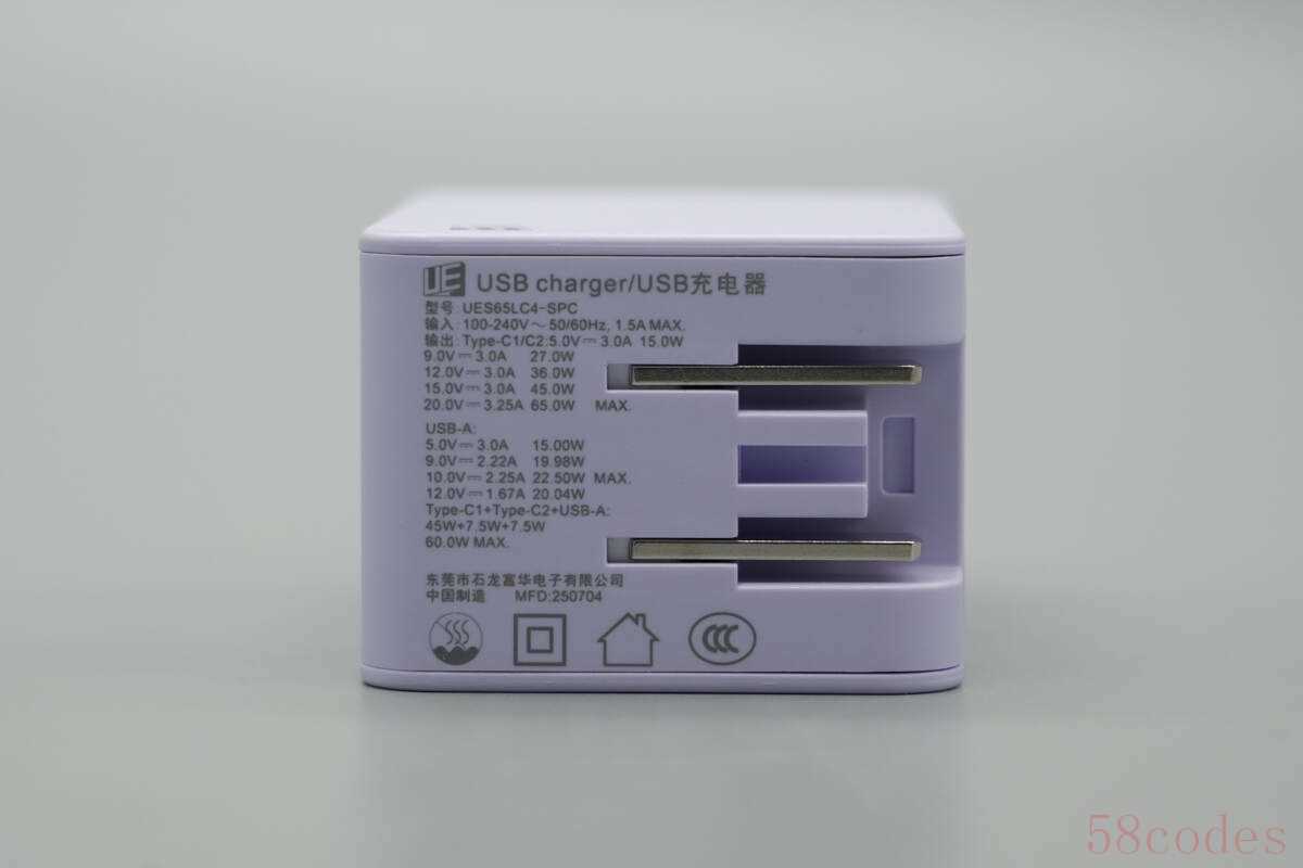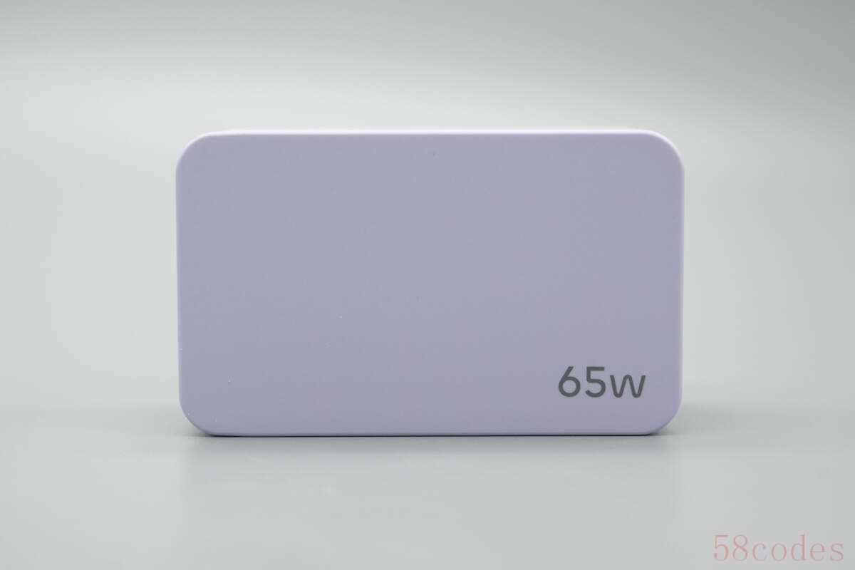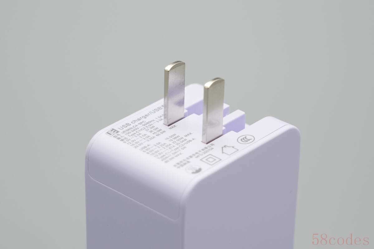 富华电子65W氮化镓充电器采用主流长条柱状造型设计,星沙质感机身搭配淡雅紫色配色,观感手感都相当不错。