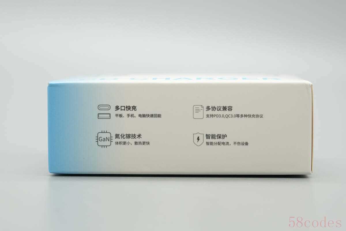 侧面印有多口快充、多协议兼容、氮化镓技术、智能保护四大卖点。