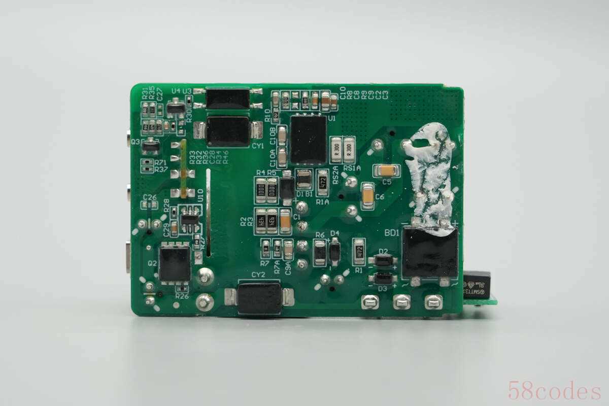 主板背面设有整流桥、开关电源主控芯片、光耦、贴片Y电容、同步整流控制器以及同步整流管。