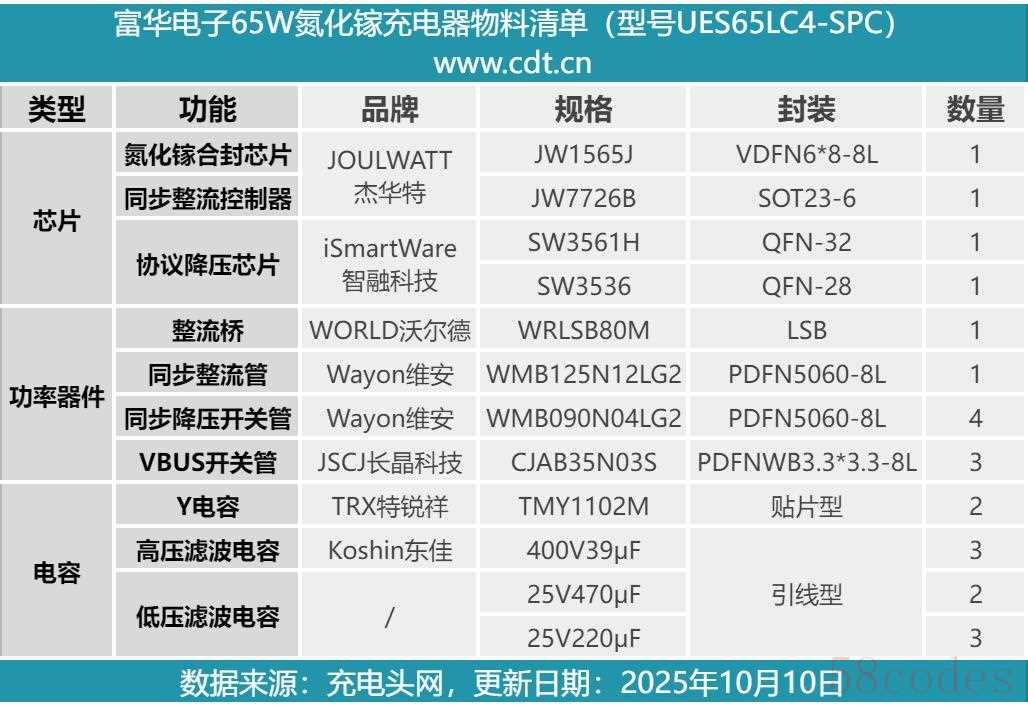 最后附上富华电子65W氮化镓充电器的核心器件清单,方便大家查阅。