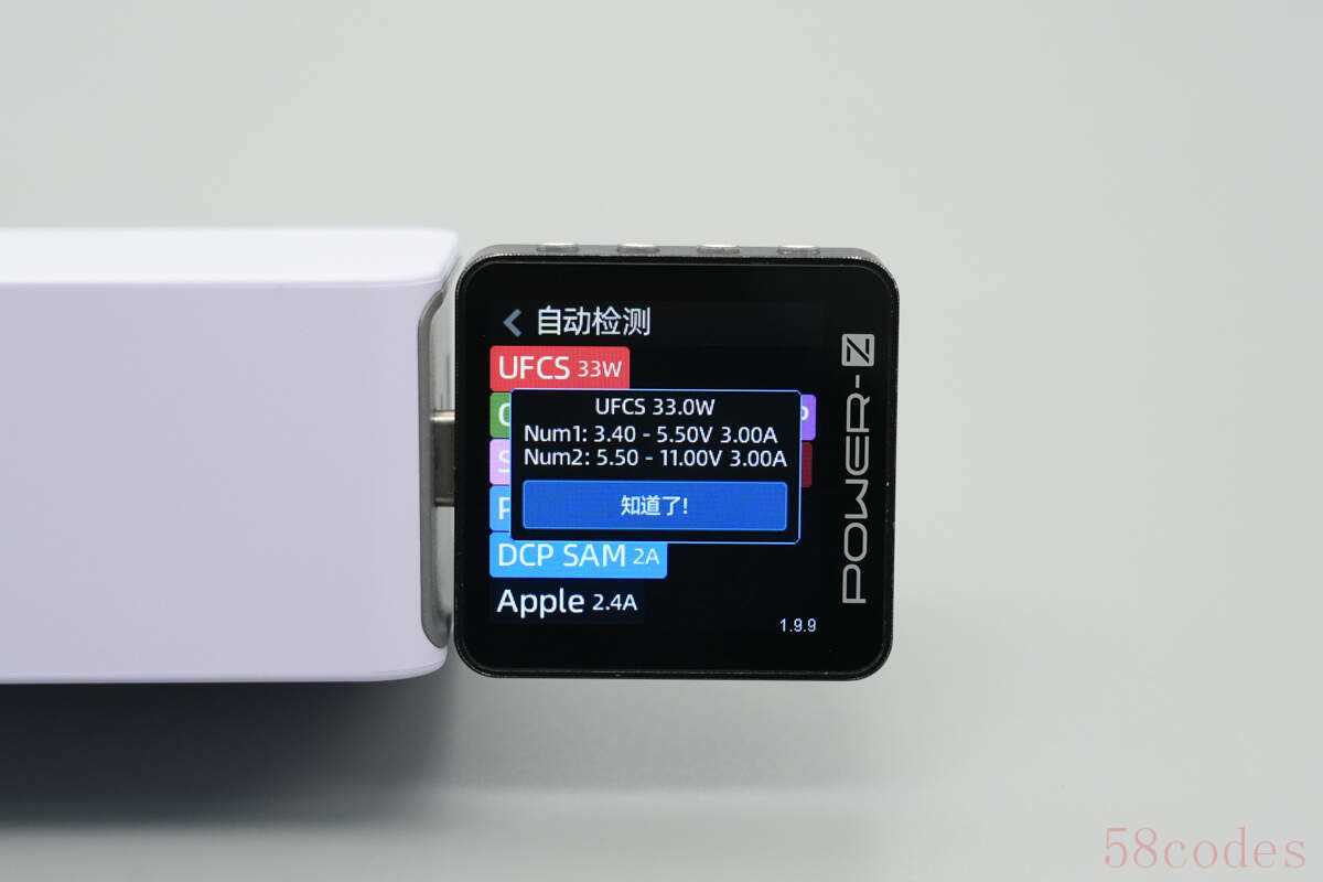测得UFCS融合快充具备3.4-5.5V3A、5.5-11V3A两组电压档位。