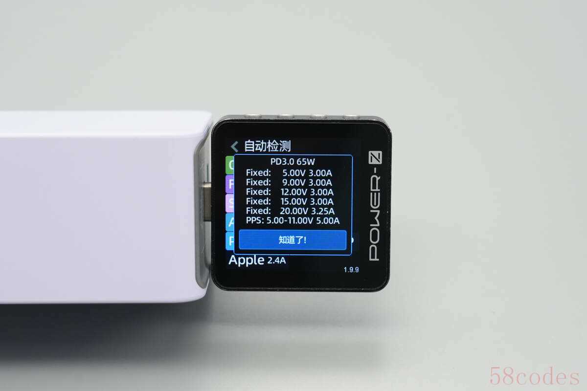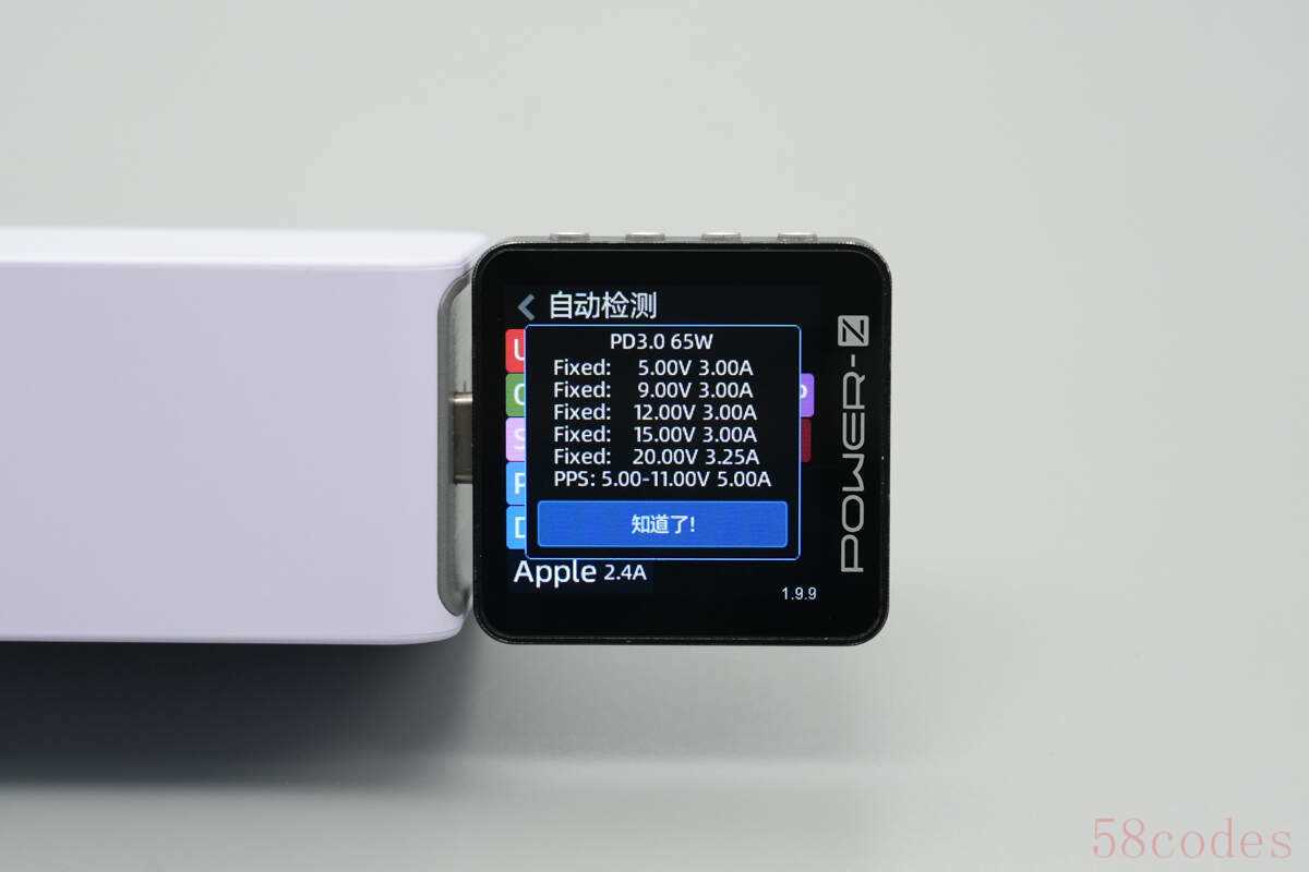 并且具备5V3A、9V3A、12V3A、15V3A、20V3.25A五组固定电压档位,以及5-11V5A一组PPS电压档位。