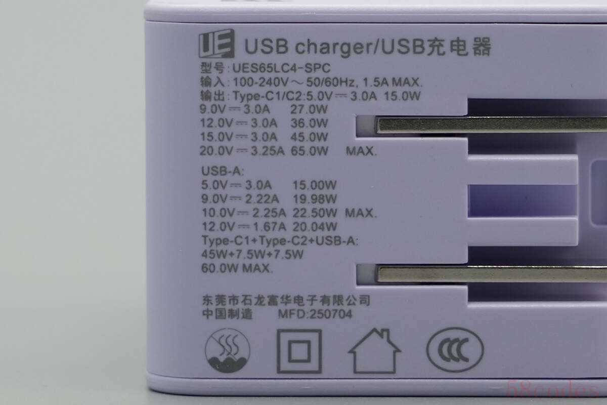 近期充电头网拿到了富华电子的的一款65W快充充电器,产品配备主流2C1A快充接口,并且兼容UFCS、PD、PPS等快充协议,可轻松应对各大品牌的笔记本电脑、平板、手机等设备,满足用户日常快充需求。