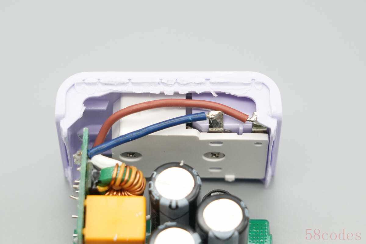 插脚通过白色塑料壳以及螺丝进行固定,采用金属片与导线锡焊实现与PCBA模块通电。