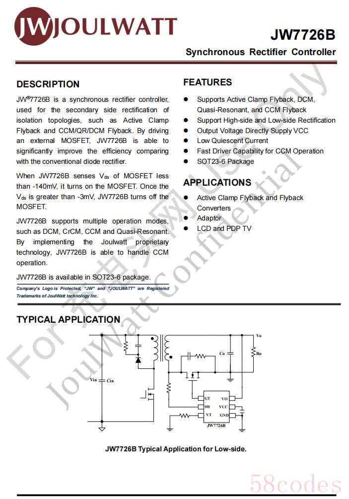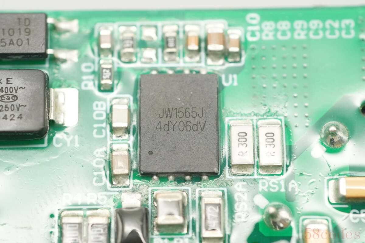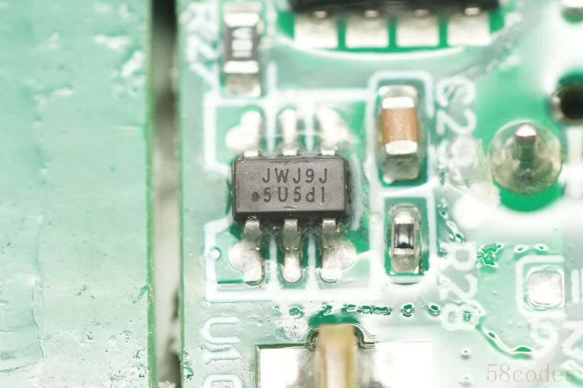 同步整流控制器来自杰华特,丝印JWJ9J,实际型号为JW7726B,是一颗同步整流控制器,支持ACF主动钳位、DCM、QR准谐振以及CCM反激的同步整流控制器,具备快速关断能力。支持高侧和低侧应用,具有低待机电流。在启动过程中(VCC建立之前)能有效防止门极gate被耦合至开启电压。
