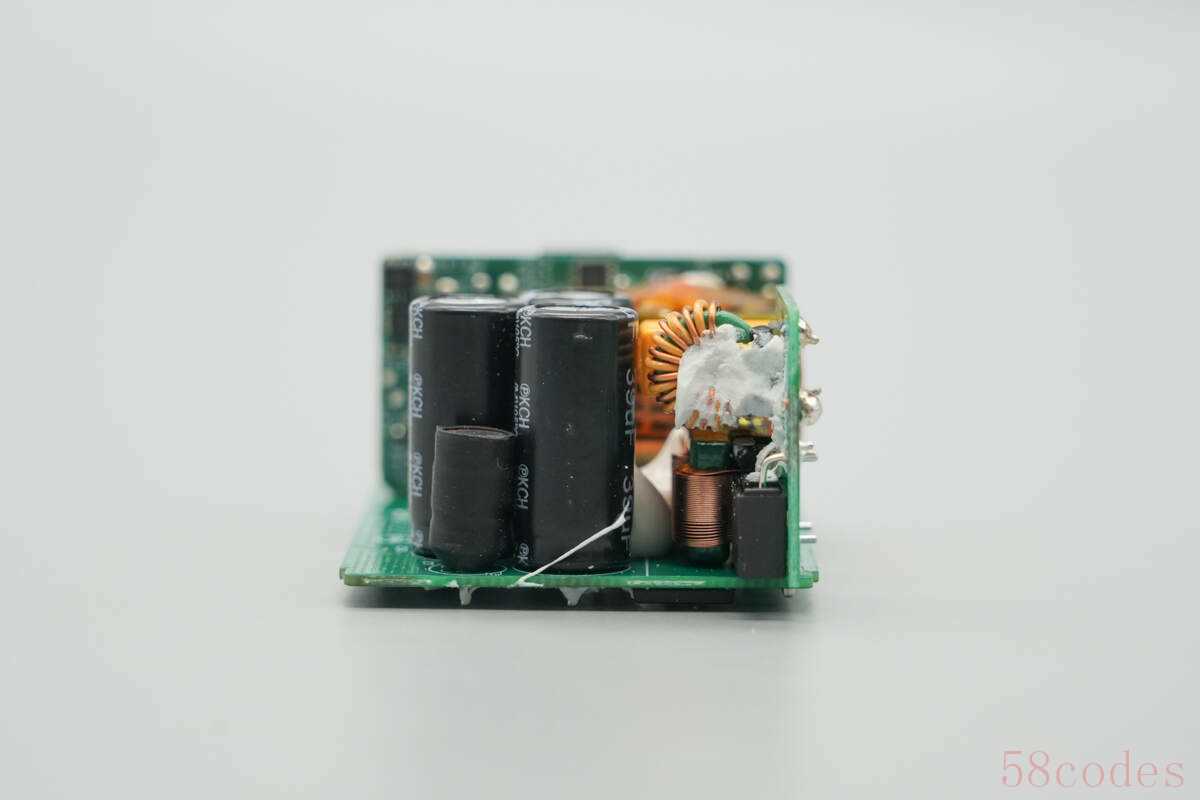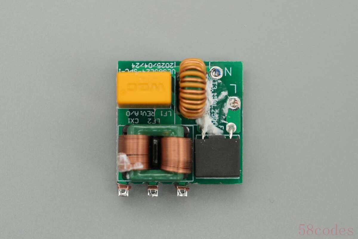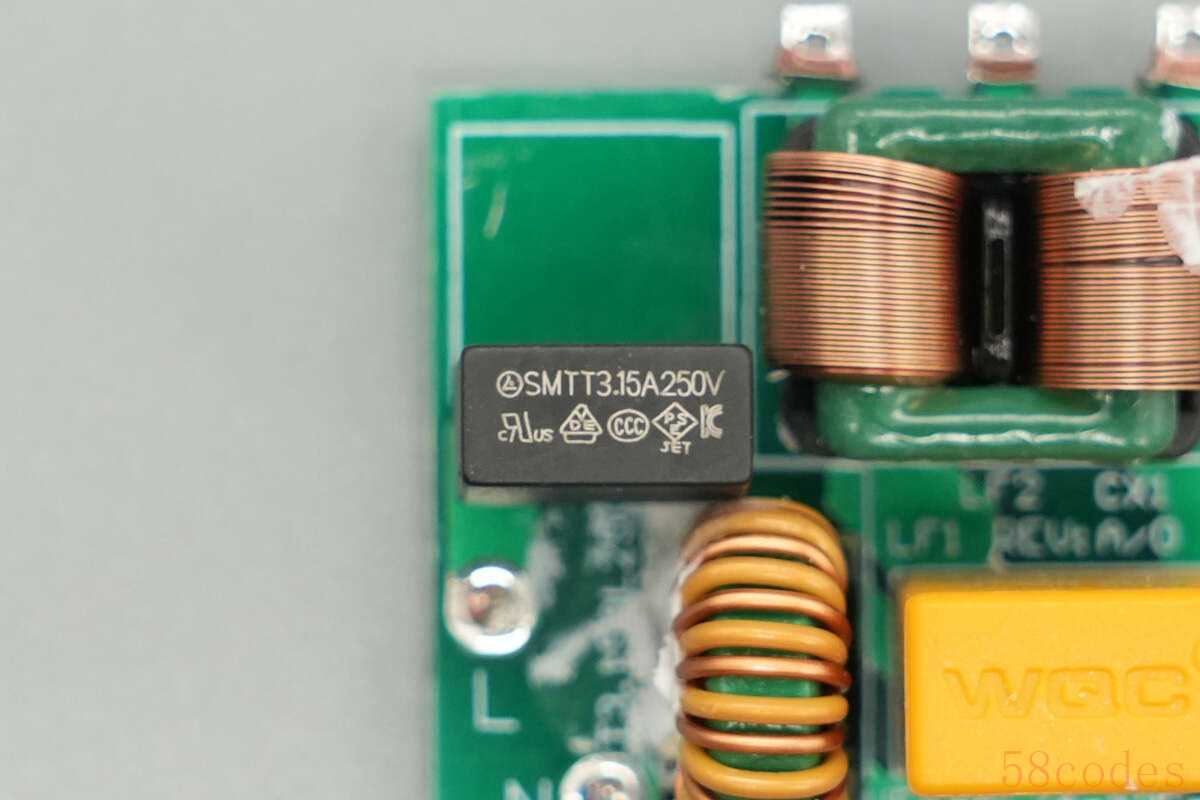 将小板拆下,正面设有延时保险丝、共模电感以及安规X2电容。