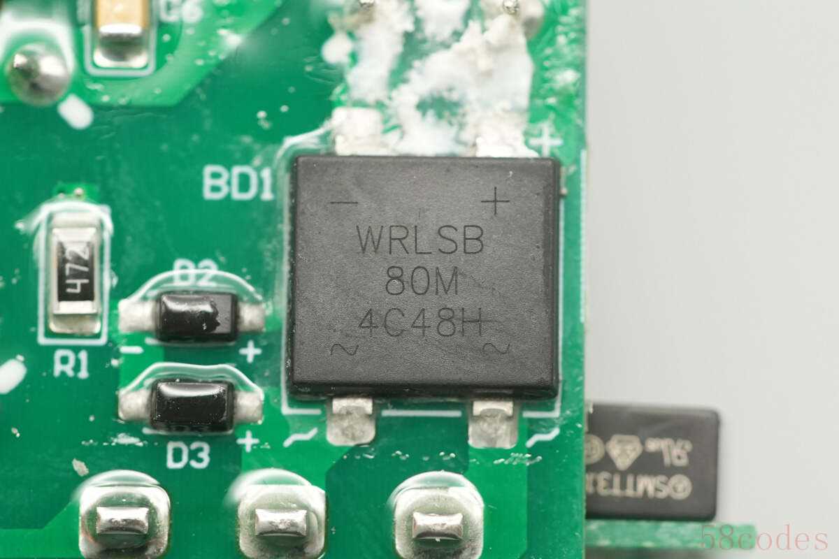整流桥来自深圳市沃尔德实业有限公司,型号WRLSB80M,这颗软桥通过较软的恢复曲线,比较平滑的关断特性,可以降低二极管结电容达到非常少的谐波振荡产生的效果。选用的LSB封装,拥有良好的散热特性,帮助中大瓦数适配器提升可靠性,单颗可做60W+。