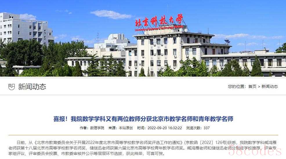 2022年9月,北科数学学科臧鸿雁、储继迅老师分别获得北京市高等学校教学名师和北京市高等学校青年教学名师,至此,数学学科已有北京市高等学校教学名师3人,北京市高等学校青年教学名师3人。