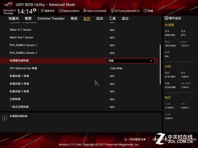 很多用户在安装了CPU水冷散热器之后CPU_FAN接口都会空出,这样就导致了BIOS不能检测到CPU散热器转速,导致保护机制启动,无法开机,这种情况下你就可以在“监控”选项卡中找到“处理器风扇转速”这项,将其设置为忽略,保存重启之后就可以正常进入系统了。
