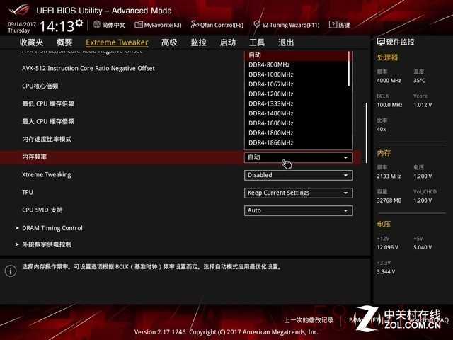 在Ai智能超频选项中选择XMP,一般能超频的内存都会有这个模板,选择它会自动将内存调整到最高超频频率。