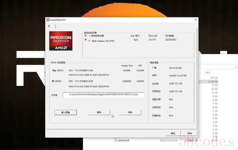 在管理员模式下启动ATIFLASH,载入我们事先下载好的BIOS,重启一下我们的电脑,就可以看到我们的5700,已经成功欺骗了GPUZ 摇身一变成为了5700XT。