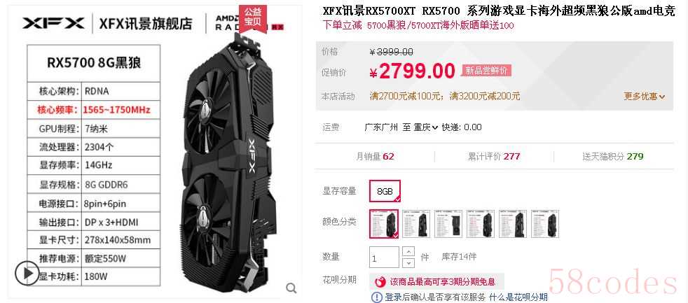 AMD Radeon RX 5700显卡,采用全新AMD RDNA游戏架构,为最新游戏大作和电竞游戏提供驱动力。拥有36组计算单元,共计2304个流处理器、64组ROPs和144组纹理单元,8GB GDDR6显存,显存频率也是14Gbps,核心基础频率则为1465MHz,游戏频率为1625MHz,Boost频率则为1725MHz,TDP为180W。天猫精选目前报价2799元,满2700元减100元,实付到手价2699元,可以考虑。