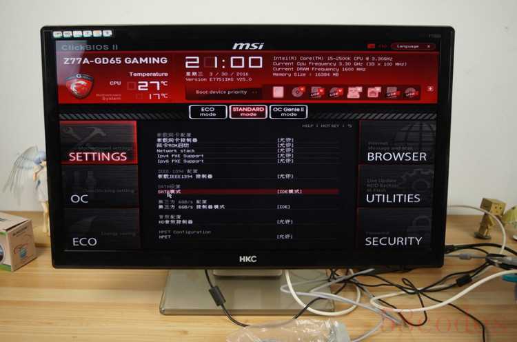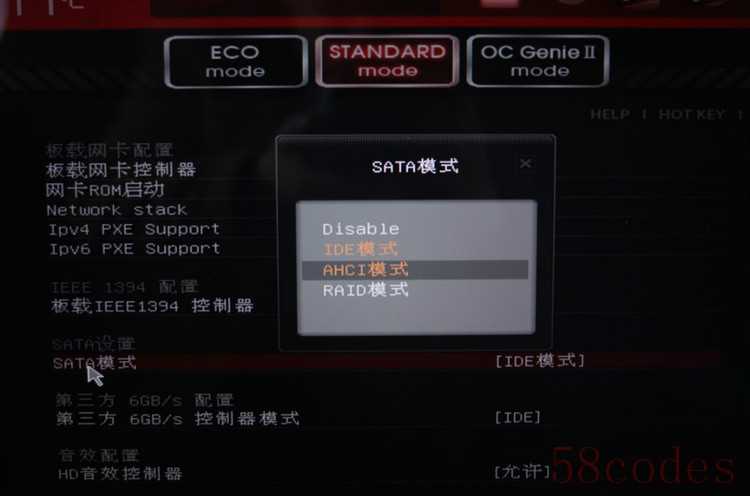 7、 确定可以正常进入安全模式之后,重启电脑,在BIOS中找到硬盘控制器模式设置选项(查找包含SATA、IDE、AHCI字样的设置选项),将硬盘模式从IDE更改为AHCI。