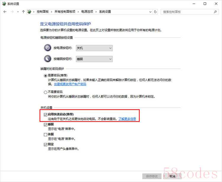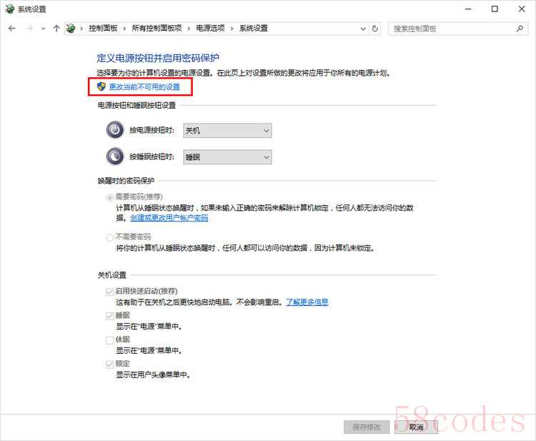 4、点击“更改当前不可用的设置”,并且关闭快速启动(关闭快速启动是恢复F8进高级启动的前提);(补充:虽然网上这样介绍,但实际上,有时不关闭快速启动也是可以的。至少在这次试验中,我所用的测试平台,就不用关闭快速启动,依旧可以按F8进高级启动选项。)