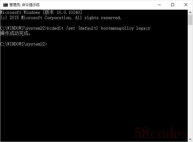 5、 按下【Win】+【X】快捷键,在快捷菜单中选择“命令提示符(管理员)”选项,在英文状态下输入“bcdedit /set {default} bootmenupolicy legacy”并回车。