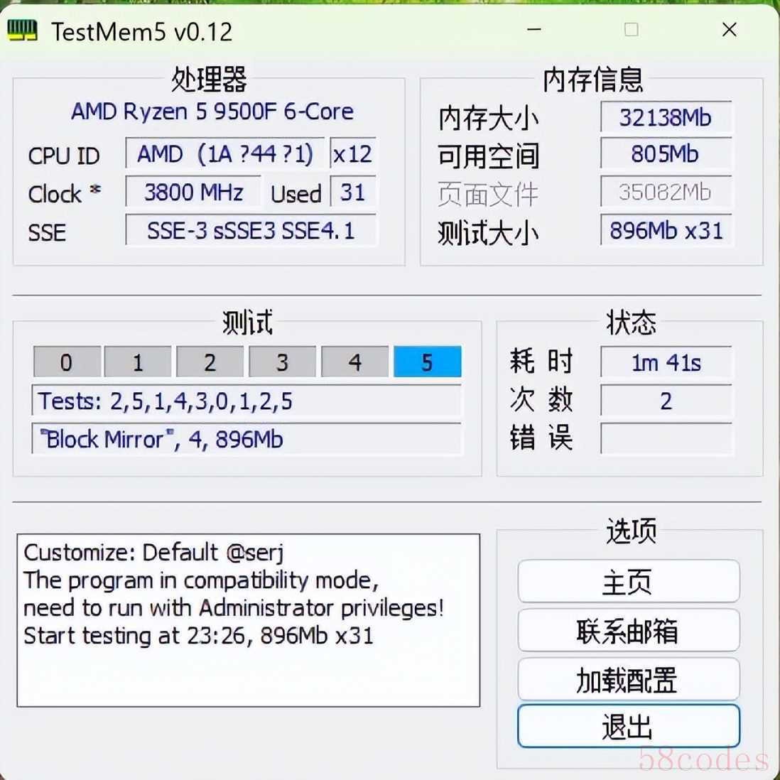 解压后右键点击TM5.exe,选择“以管理员身份运行”。程序启动后,点击“加载配置”按钮,选择anta777的配置文件。然后程序会自动开始运行测试。让程序完整跑完 3 圈(Cycles),耗时大约10-20分钟。如果右侧“状态”栏中的“错误”始终为0,那么恭喜你,日常使用和绝大部分游戏场景基本就稳了。若想追求24/7全天候的绝对稳定,建议挂着跑10圈以上,甚至通宵测试。如果在测试过程中,只要出现任何一个“错误”(Error),就说明当前设置不稳定。此时应立即停止测试,重启进入BIOS进行微调(通常是增加一点电压或放宽一点时序),直到TestMem5工具完全无报错为止,这样你的超频才算是完成了。