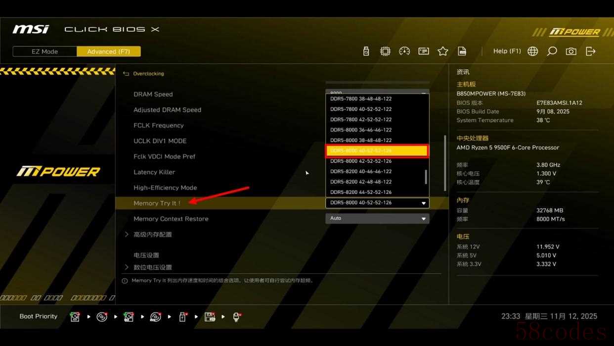 "目标:" 将微星 B850M-POWER 主板上的内存频率稳定运行在 "8000MHz"。