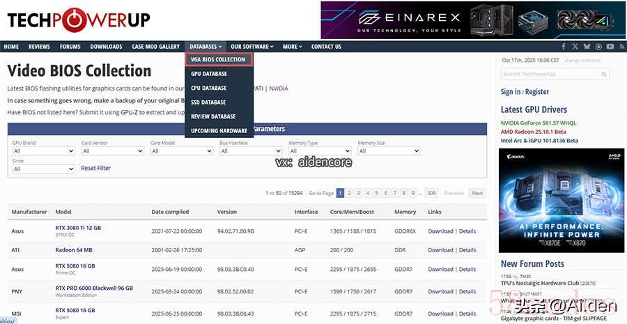 在菜单栏选择 DATABASES -> VGA BIOS COLLECTION 进入页面,通过搜索就可以找到对应显卡的各种 BIOS 文件,下载后也是压缩包,解压后会得到一个 .rom 的文件,将这个文件移动到上面 nvflash/x64 的文件夹中,方便后续的命令操作。