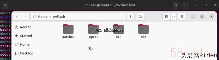 下载的是压缩包,解压后可以将文件夹重命名为 nvflash,方便后续命令操作,正常会有四个子文件夹,分别为:aarch64、ppc64、x64、x86,一般使用的是 x64 文件夹里的 nvflash 程序,对应 64 位操作系统。