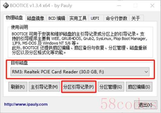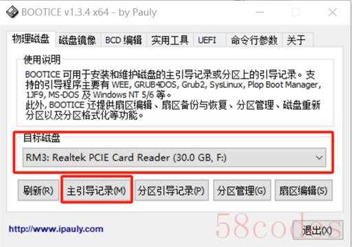 4、下载BOOTICE软件(不方便放链接,问kimi或DeepSeek给链接就行了。)5、打开BOOTICE软件,选择TF卡,将主引导记录更改为GRUB4DOS。